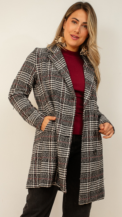 DESCRIPCIÓN: ABRIGO CON DISEÑO CUADROS CON BOLSILLOS FRONTALES Y 1 BOTON. TELA LIVIANA