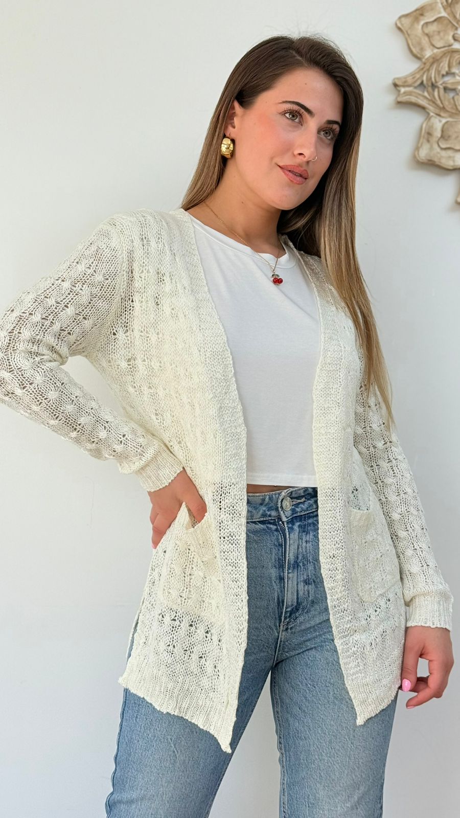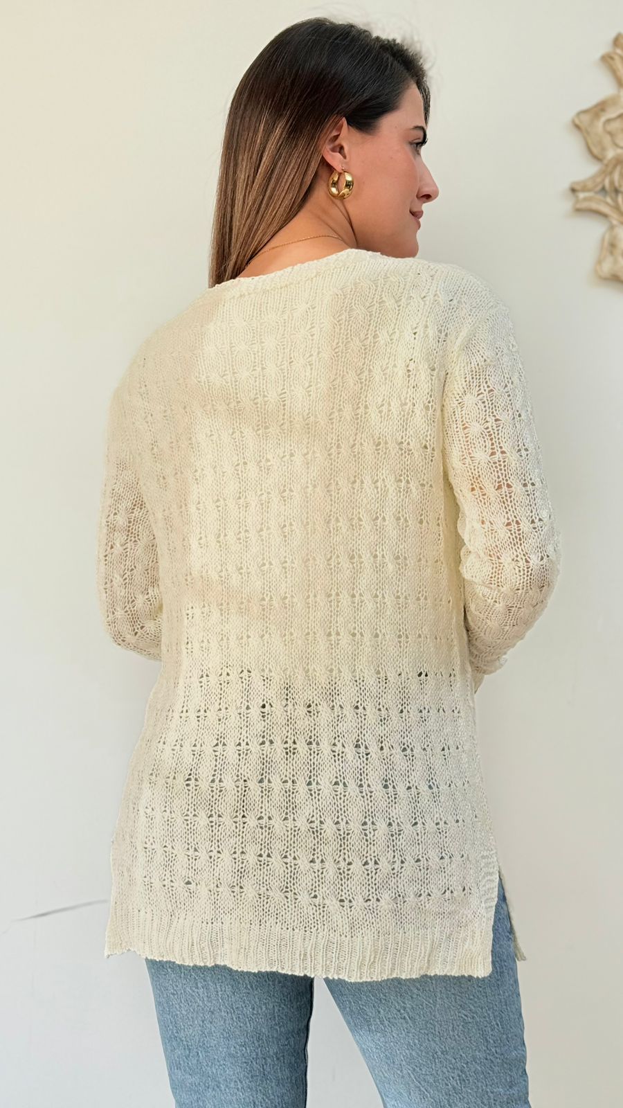 DESCRIPCION: HERMOSO CHALECO TIPO TAPADO DE DISEÑO CALADO.
