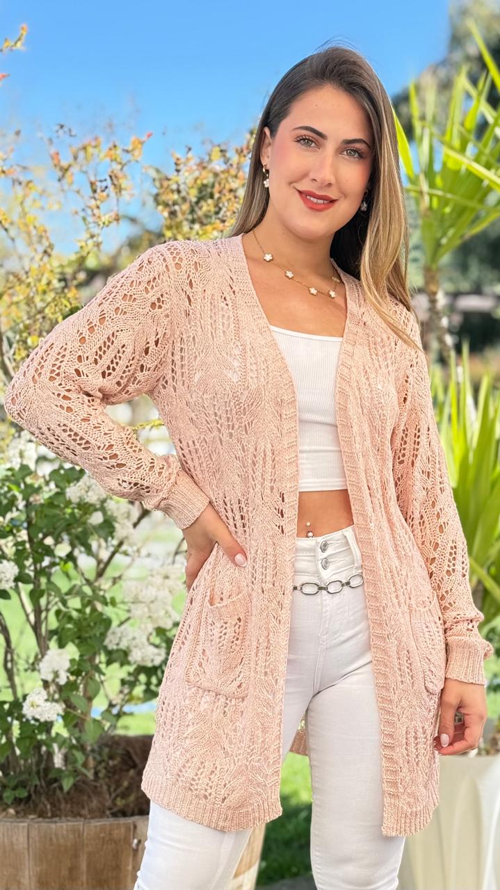 Tejido calado, liviano y con un diseño de hojas que le da un toque femenino y elegante. Ideal para la transición de temporada o para complementar looks primaverales. Posee bolsillos delanteros y puños ajustados, brindando comodidad y estilo a la vez.