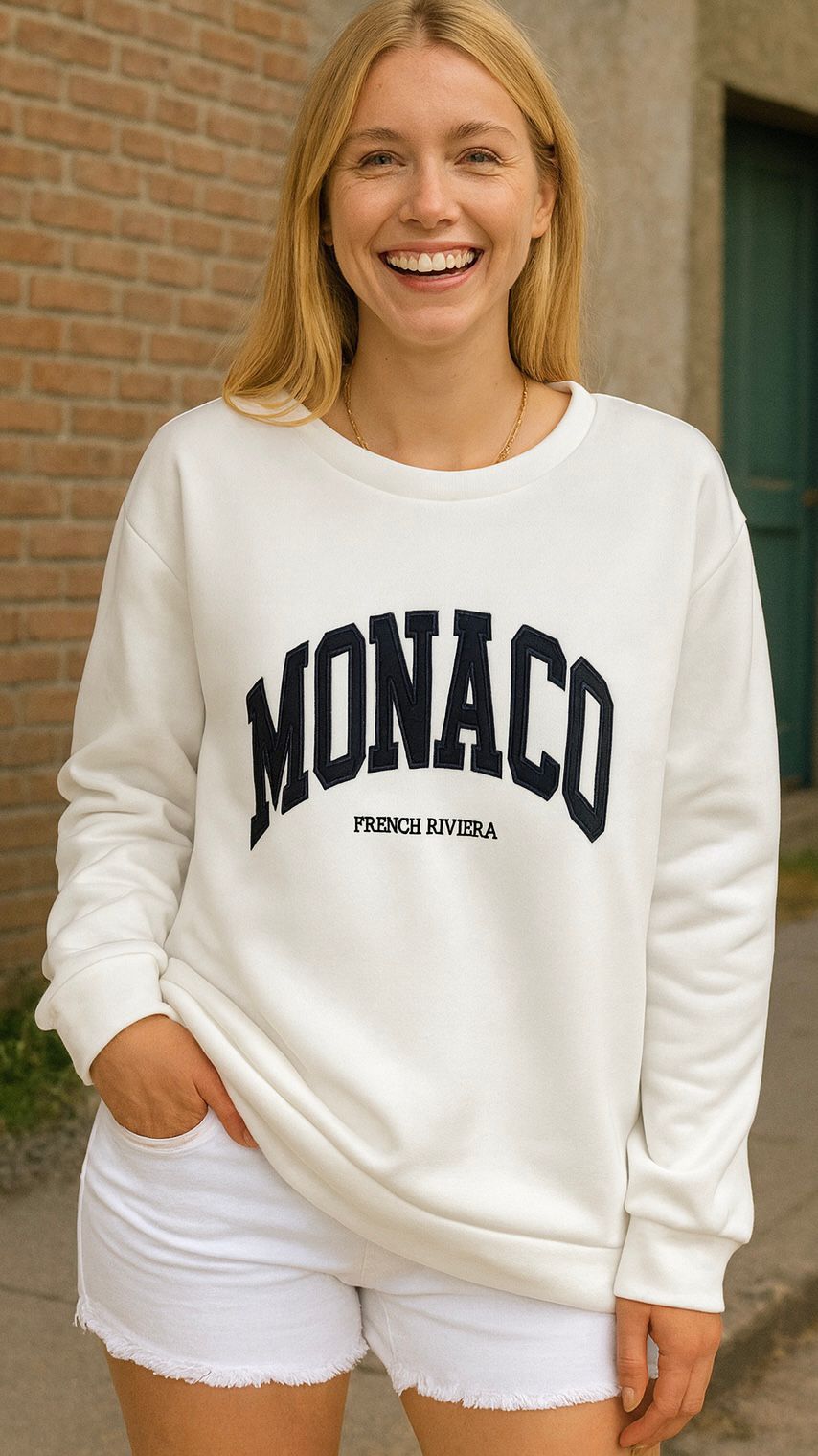 Un clásico moderno con un toque europeo 🇫🇷✨. Este polerón blanco destaca por su diseño bordado en azul marino, con el lettering “MONACO” en relieve.
