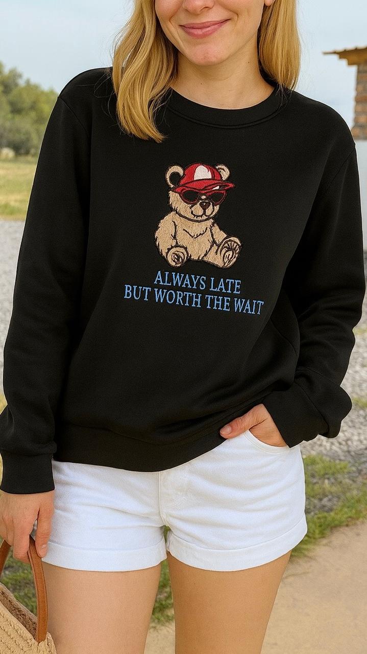 Este polerón negro combina estilo y actitud con su bordado de oso con gorra roja y lentes, acompañado de la frase “Always Late But Worth The Wait” en letras azules. El diseño destaca por su bordado detallado y su tejido suave, ideal para lograr un look casual pero con personalidad.