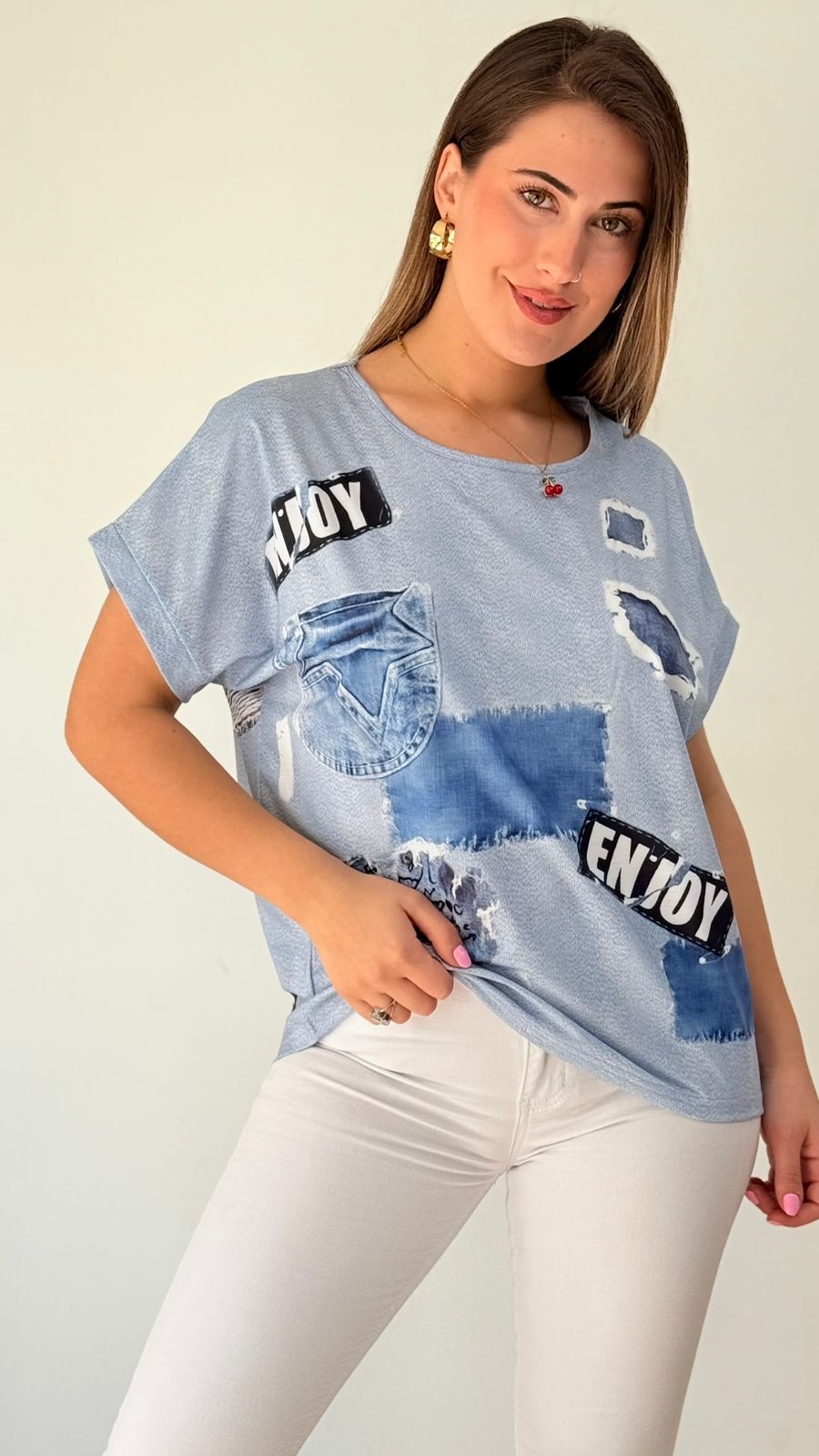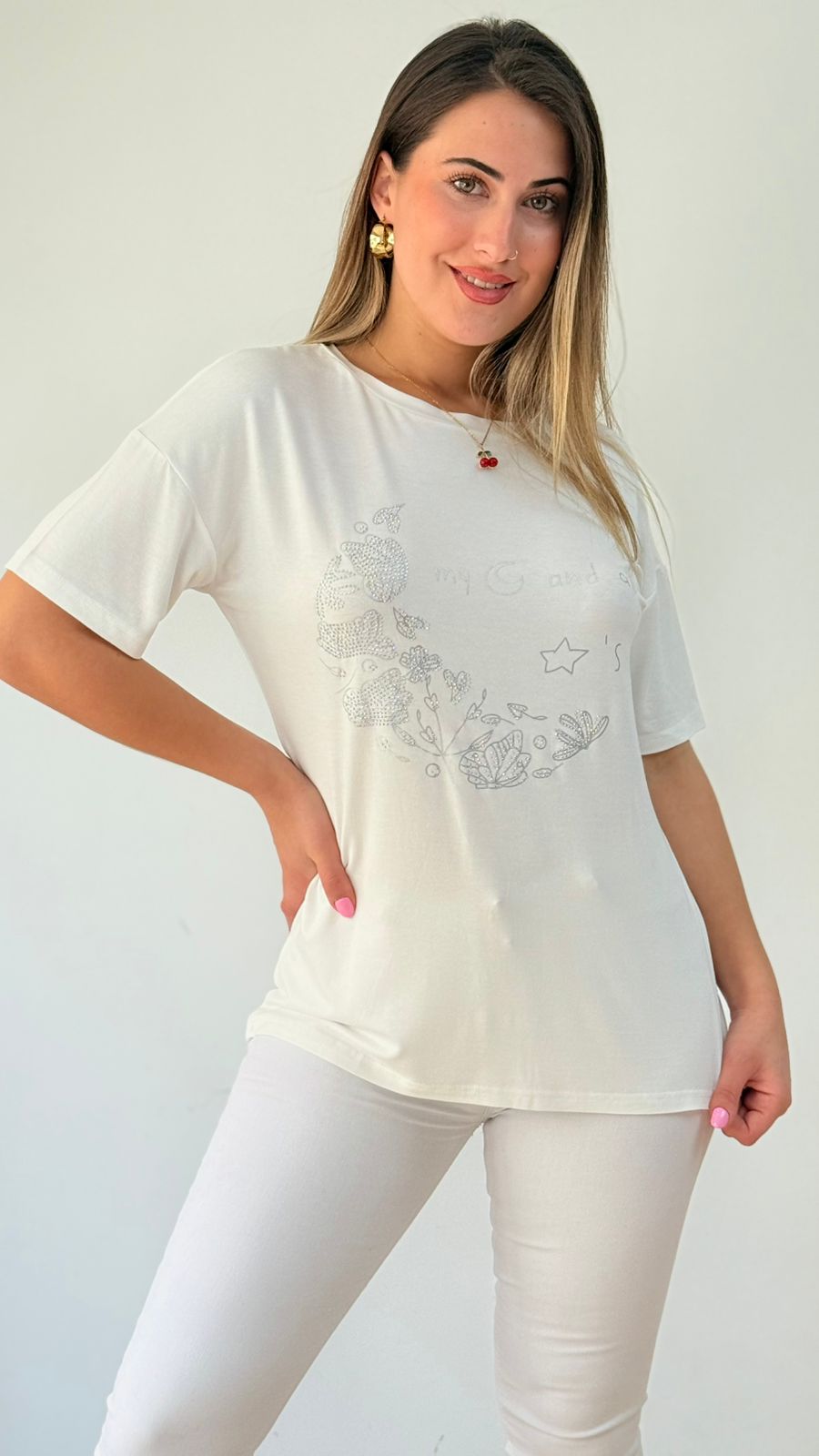 DESCRIPCION: POLERA BASICA DE CUELLO REDONDO, TELA ELASTICADA, CON DISEÑO EN COLOR PLATEADO Y BRILLOS.