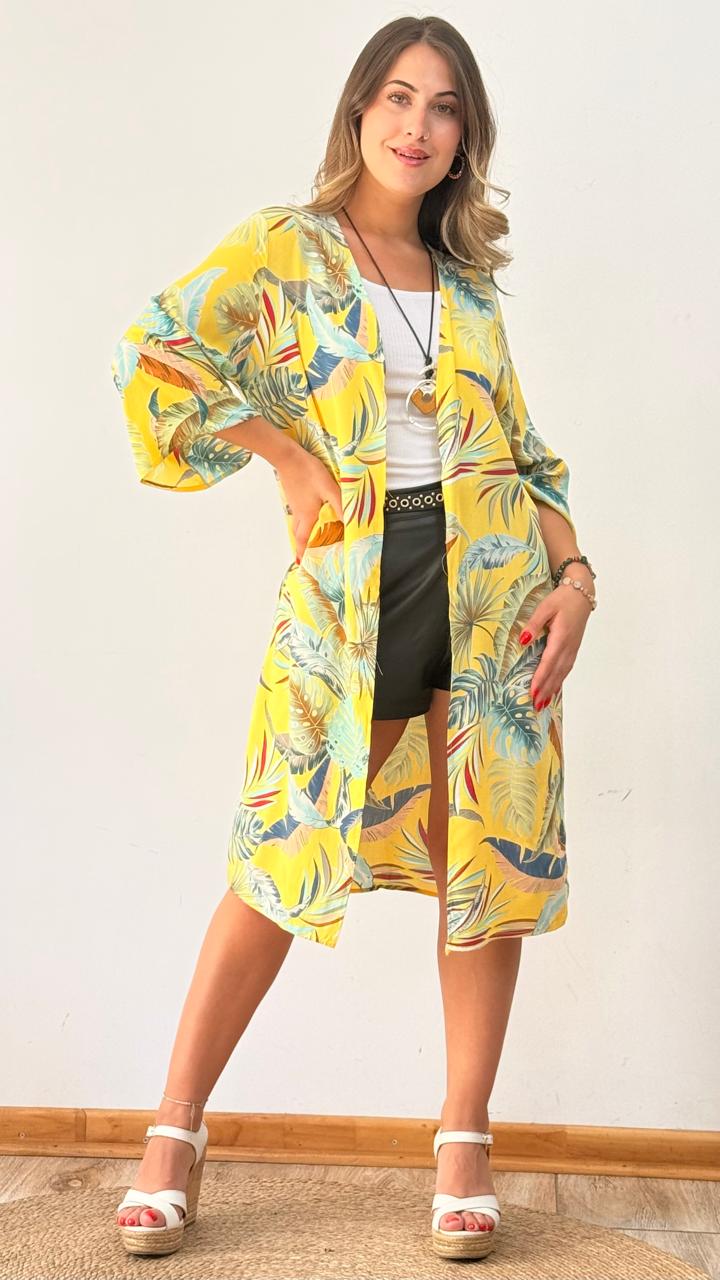 DESCRIPCION: HERMOSO TAPADO TIPO KIMONO DE TELA LIVIANA CON DISEÑO HOJAS.