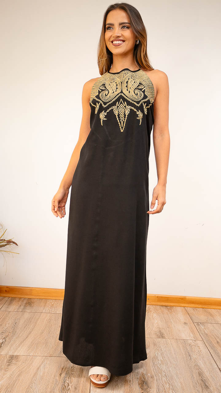 DESCRIPCION: HERMOSO VESTIDO DE ESPALDA DESCUBIERTA CON BORDADO DE HILO DORADO, IDEAL PARA USAR DE MANERA CASUAL O FORMAL.