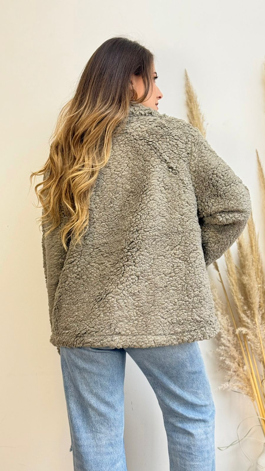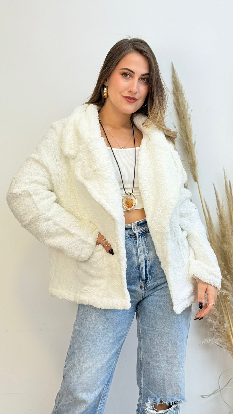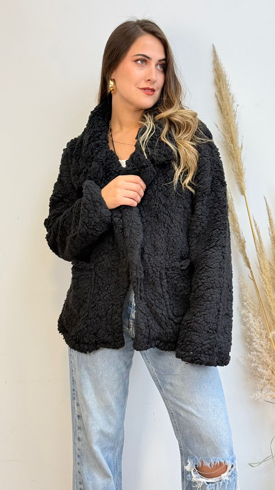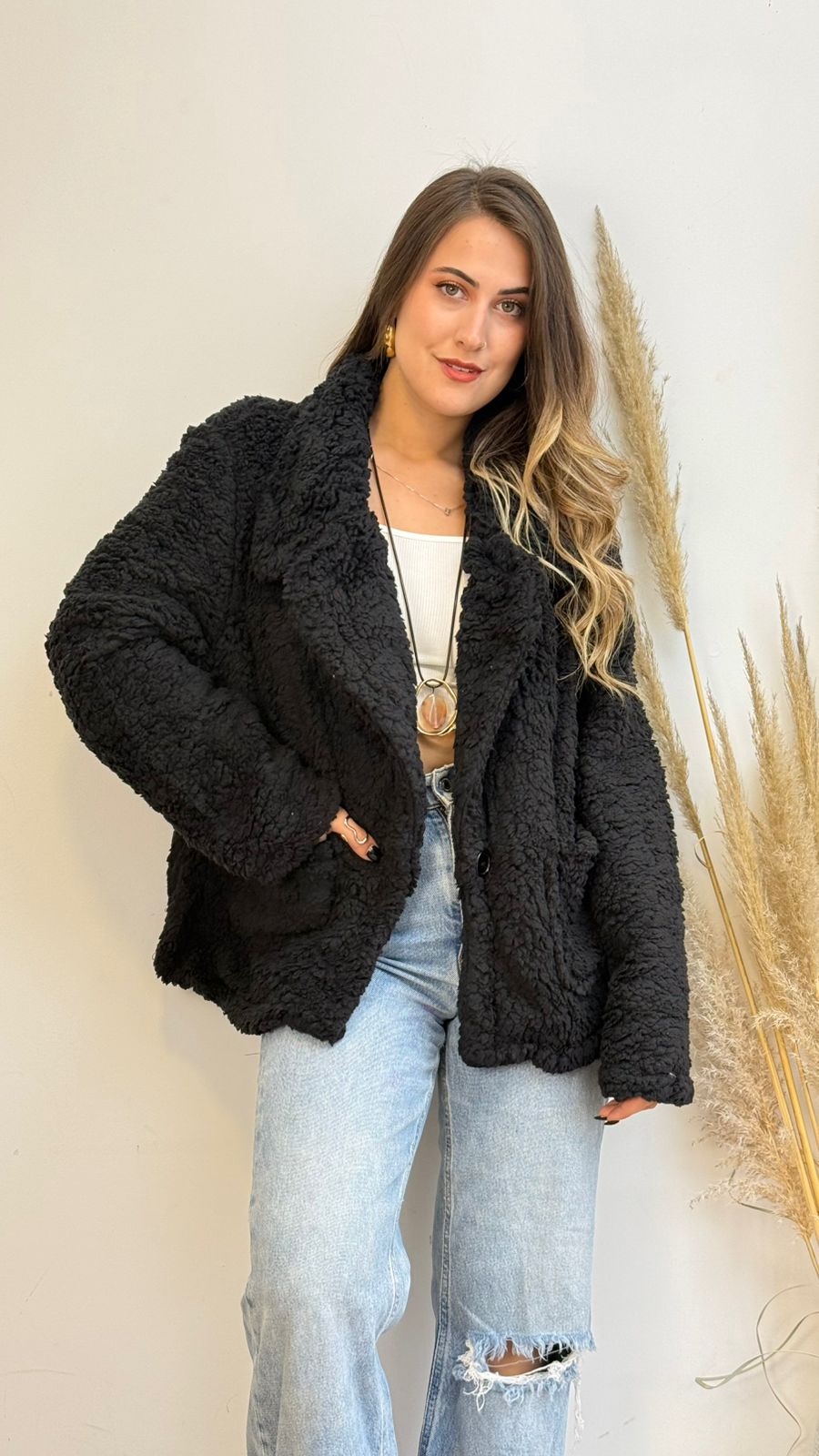 Abrigo de tela chiporro con solapa, estilo oversize, presenta bolsillos y broche, ideal para los días más fríos.