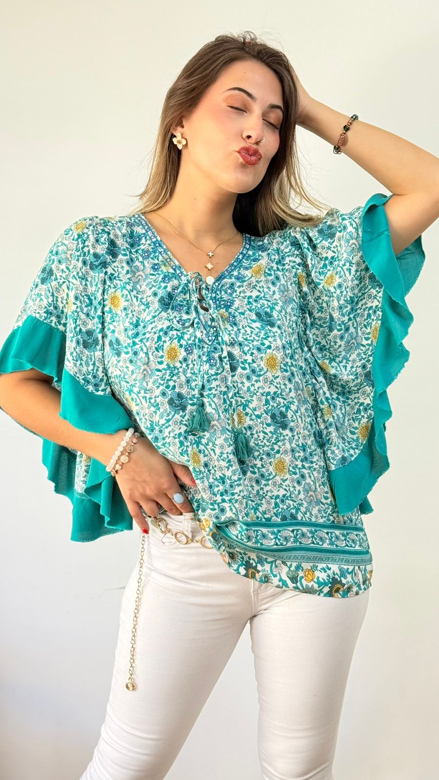 DESCRIPCION: LINDO BLUSON ESTAMPADO FLORES CON MANGAS ANCHAS.