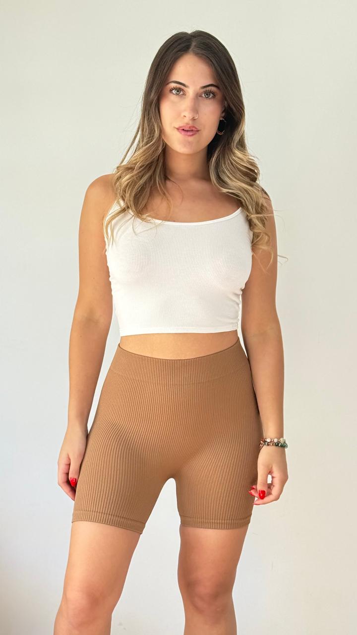 DESCRIPCION: CALZA CORTA TIPO ACANALADA DE TELA ELASTICADA, TIRO ALTO.