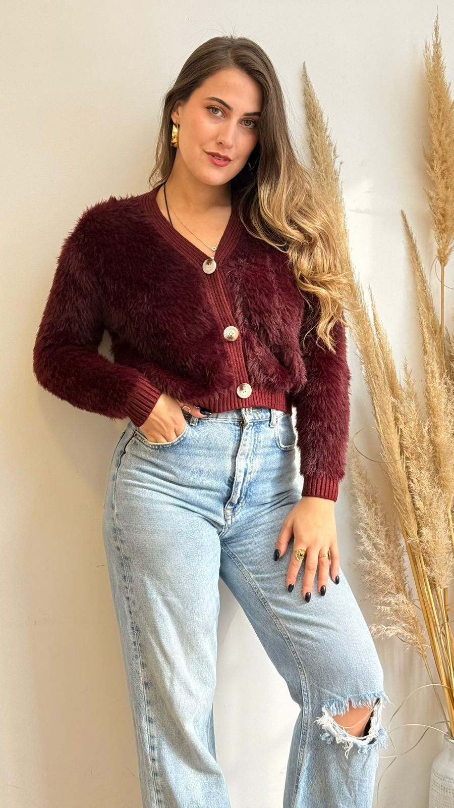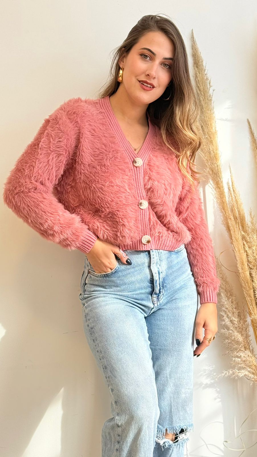 Cárdigan con botones corto, de tela peludita tipo peluche, ideal para los días más fríos.
