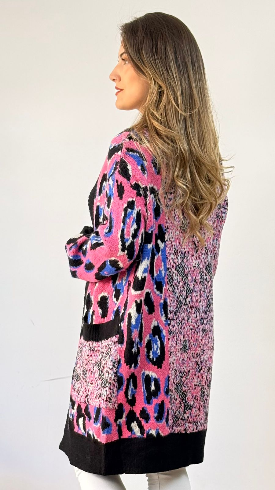 DESCRIPCION: CARDIGAN CON BOTONES Y BOLSILLOS, DISEÑO ROMANTICO EN TONOS ROSA.