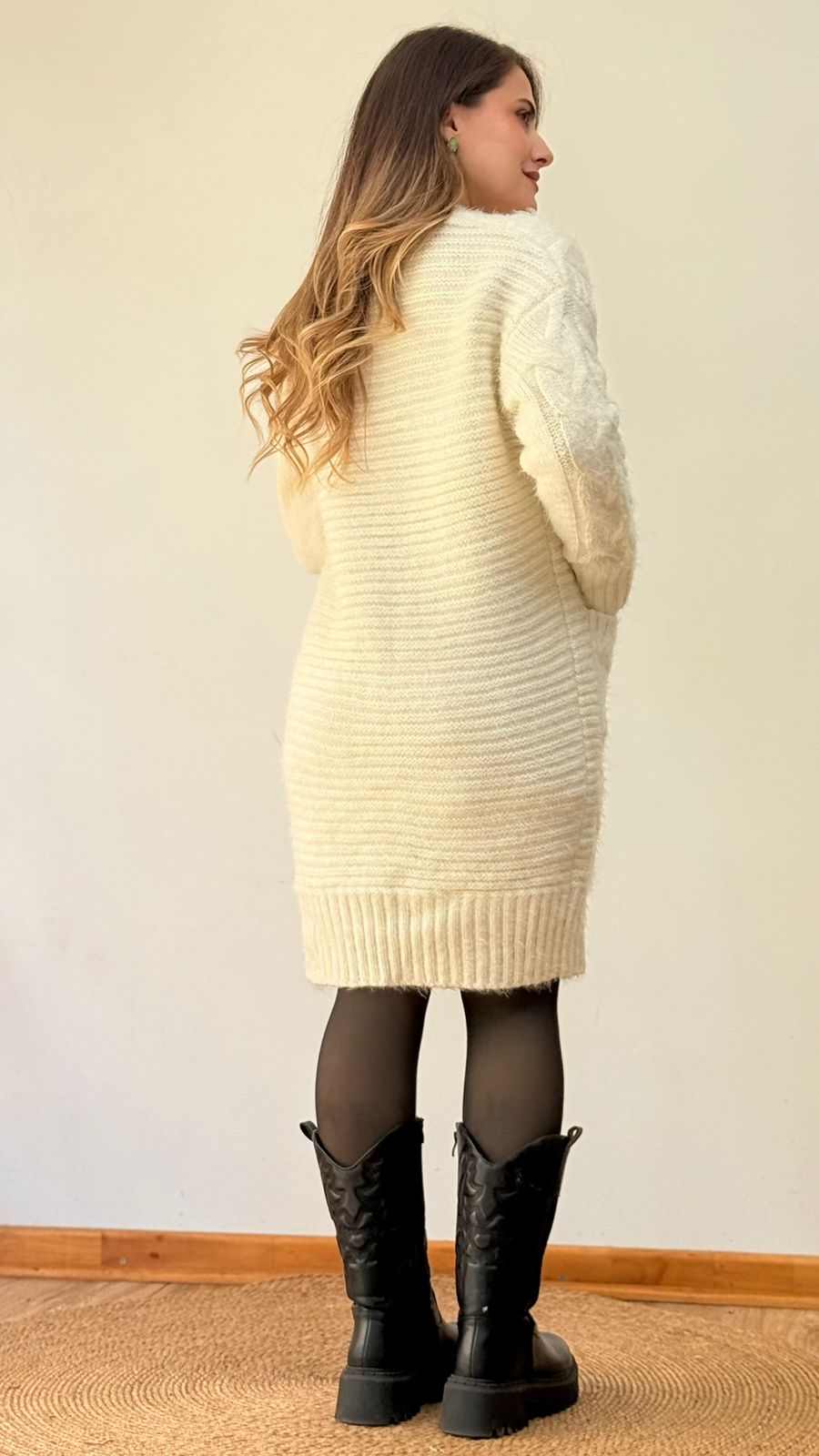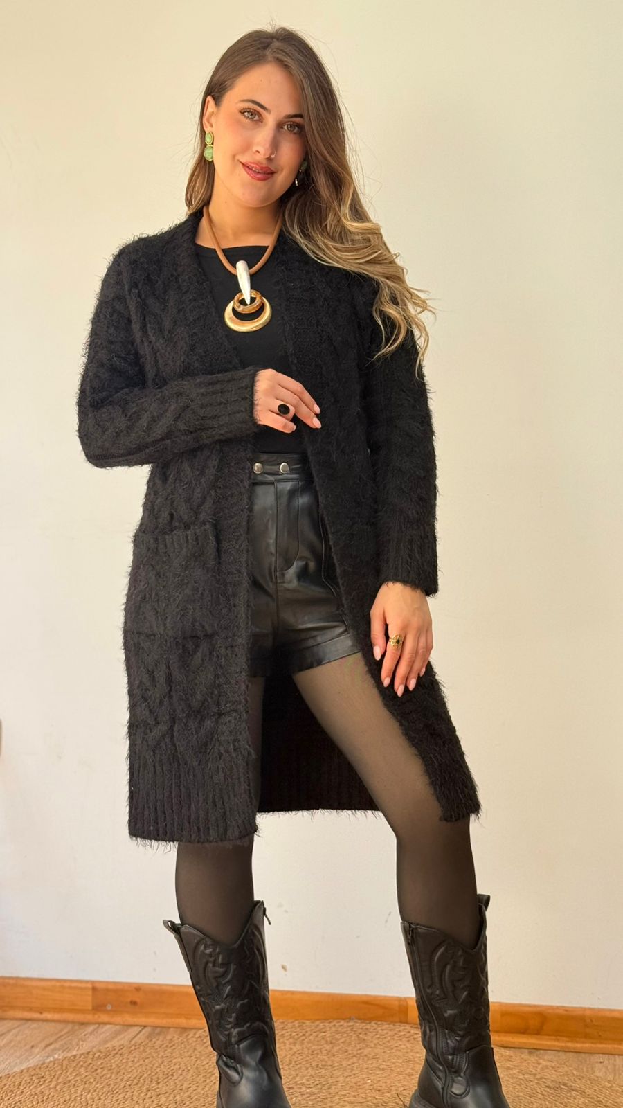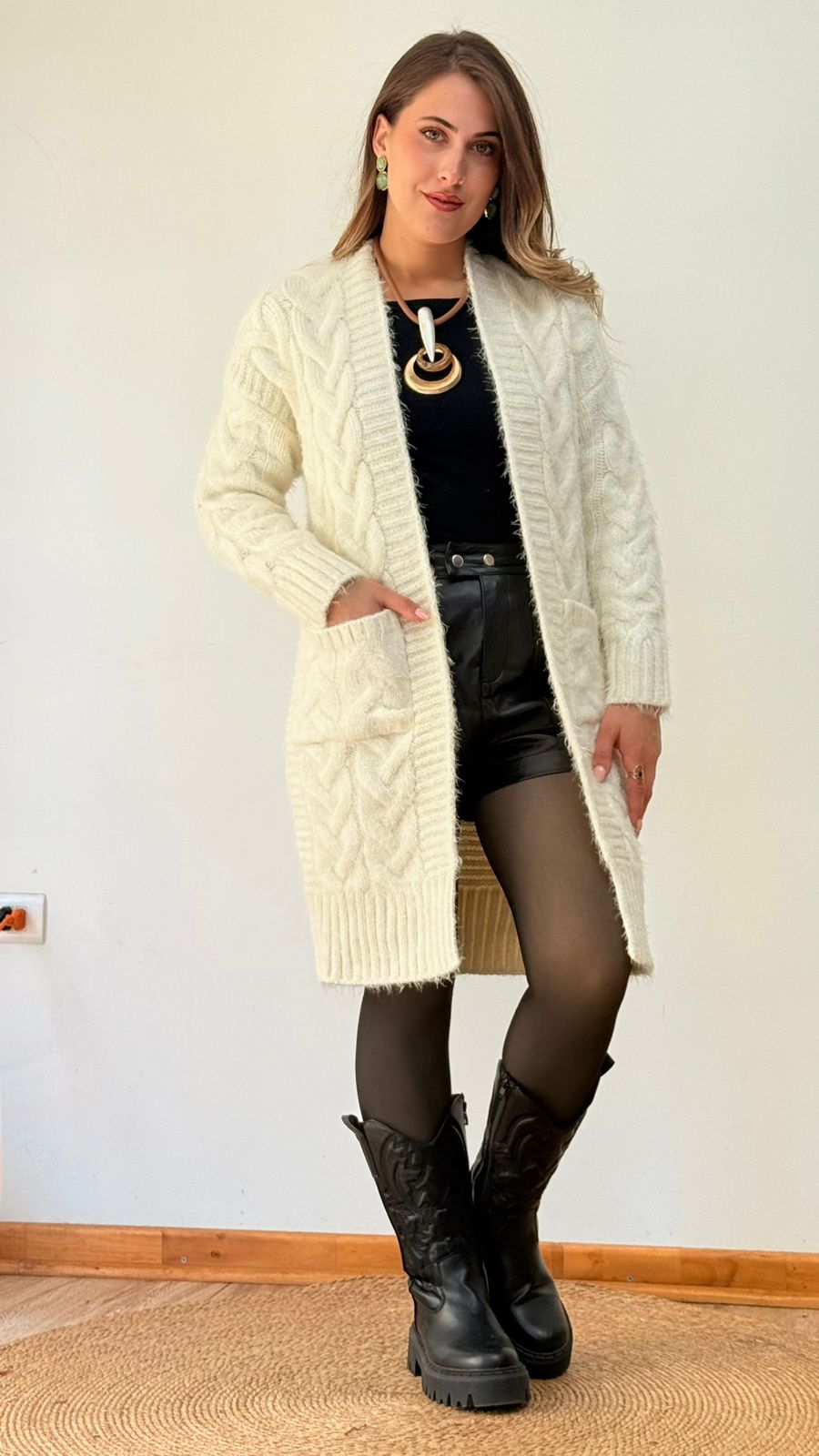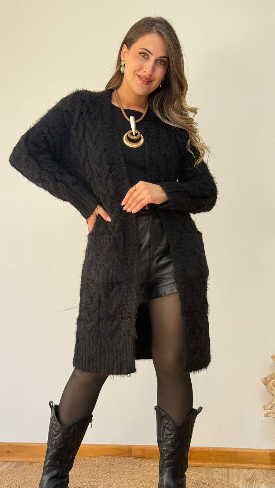 Cardigan largo de punto trenzado, textura suave y con bolsillos. Calce cómodo y fácil de combinar.