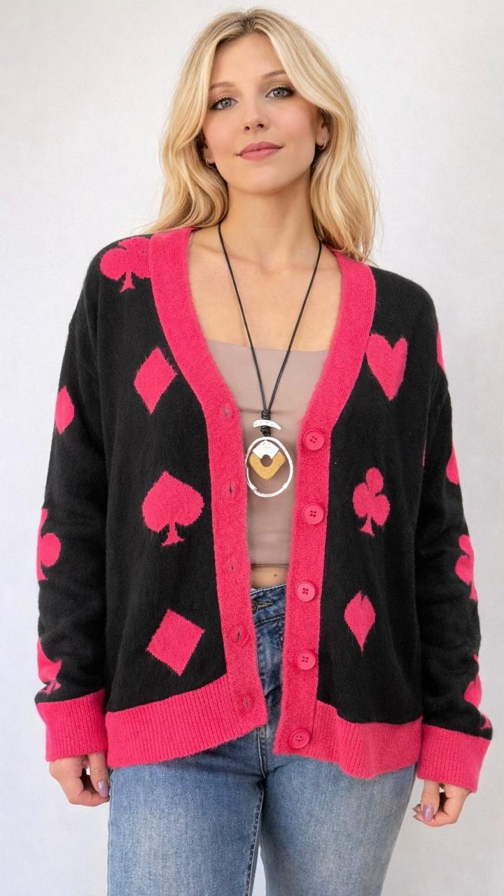 DESCRIPCIÓN: CARDIGAN DE TELA ABRIGADORA CON BOTONES Y DISEÑO POKER.