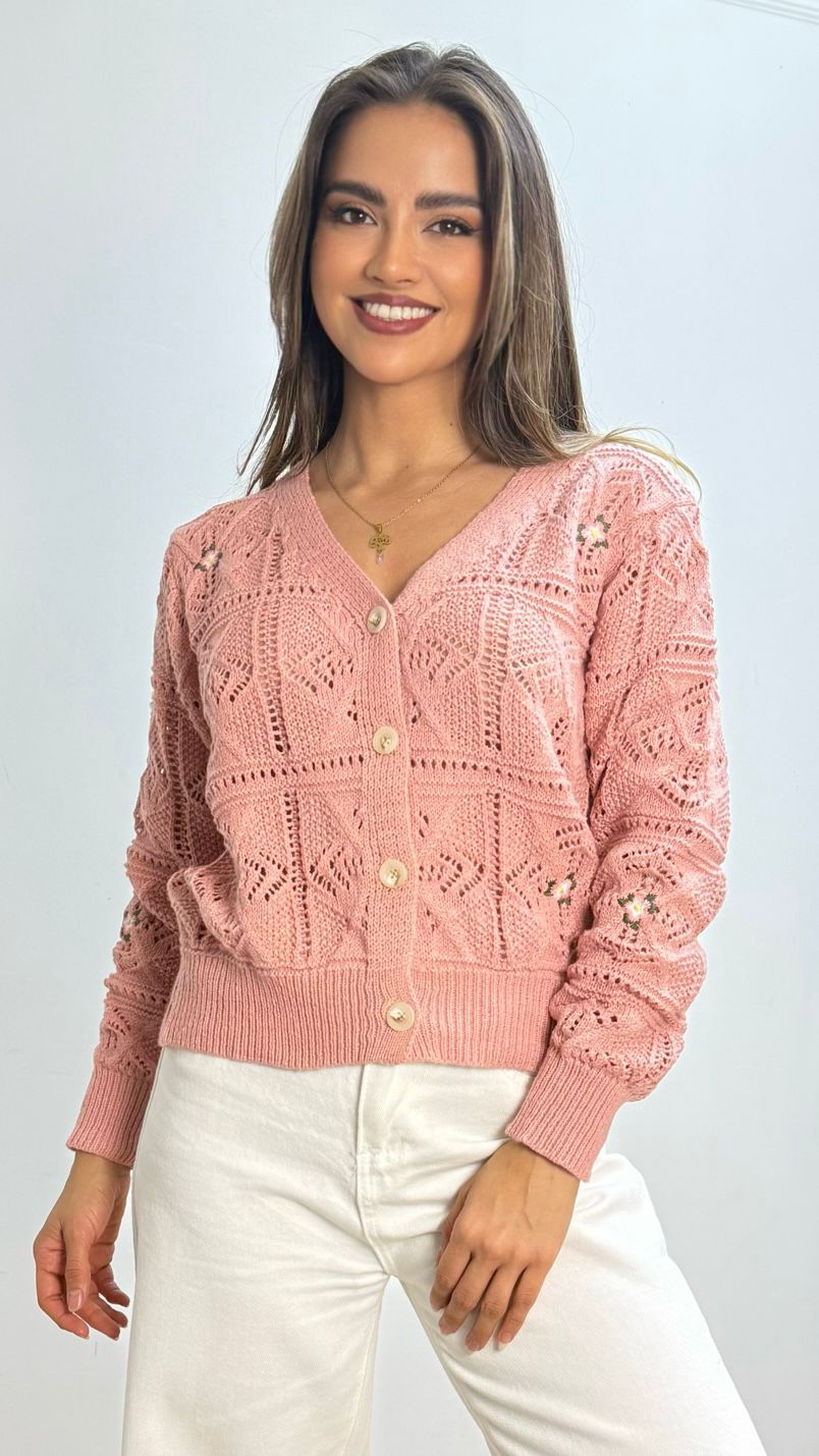 Chaleco femenino y delicado, tejido en punto calado con diseño geométrico y detalles florales bordados. Su estilo ligero y elegante lo convierte en una prenda versátil, ideal para looks casuales o más sofisticados. Cuenta con botones frontales y pretina ajustada en la basta y puños para un calce perfecto.