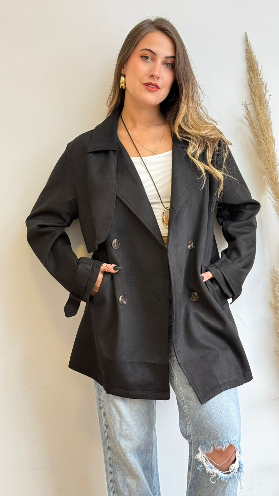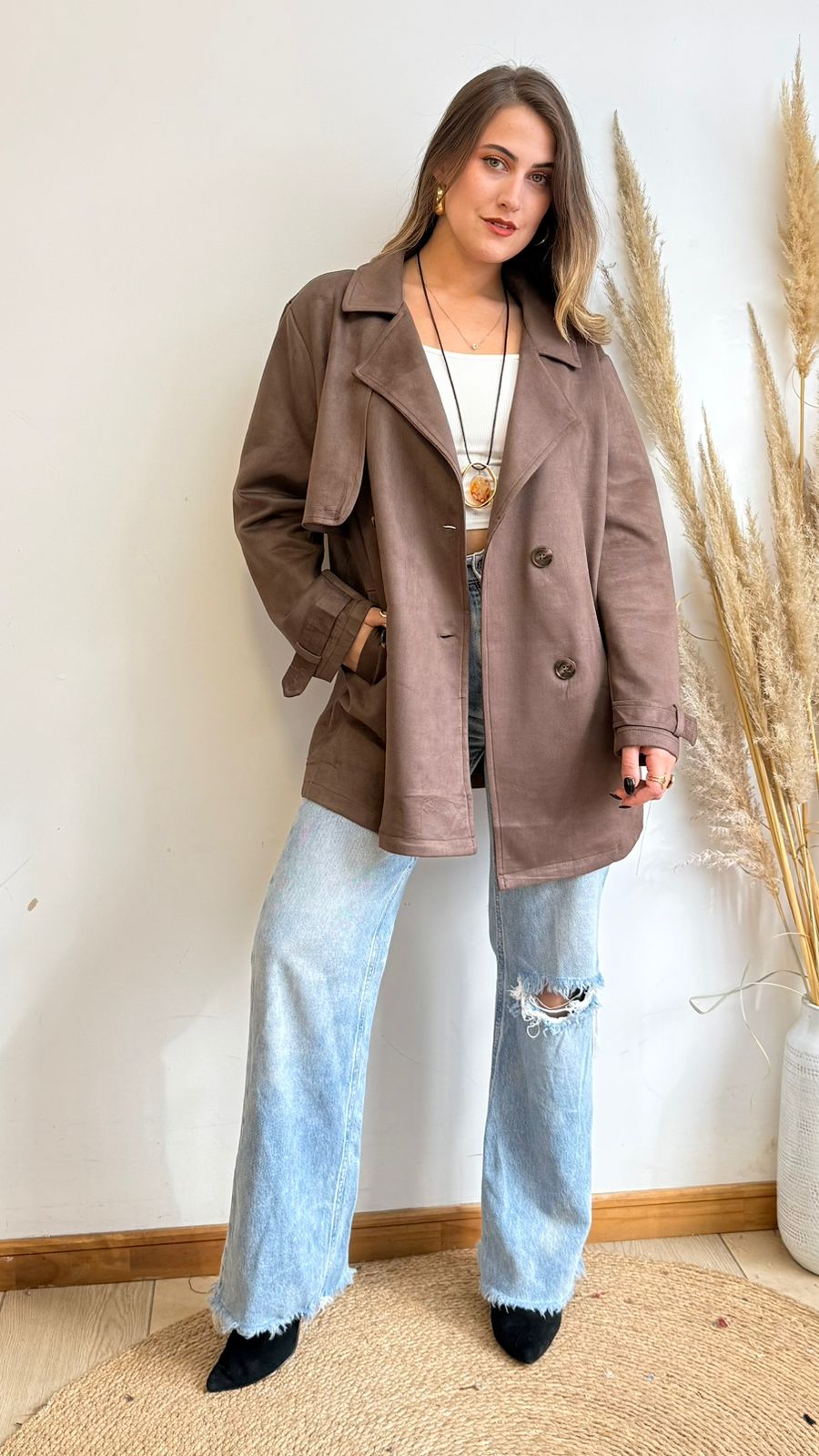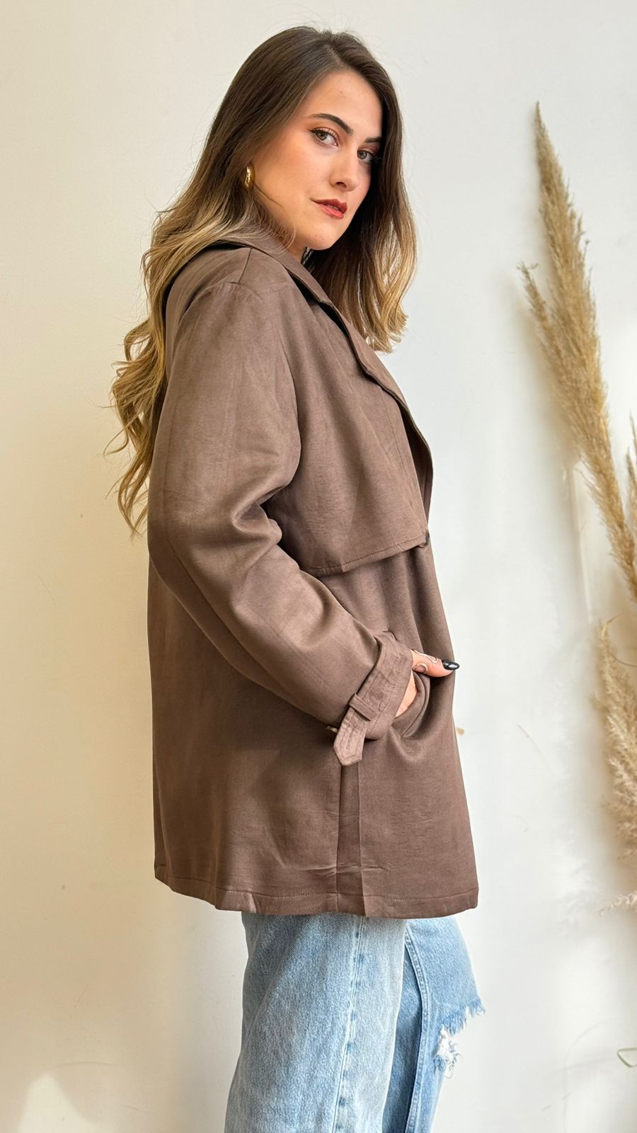Chaqueta de tela tipo gamuza, estilo trench, presenta botones frontales y cuello solapa, ideal para los días más fríos.