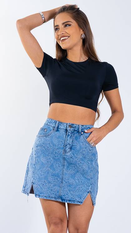 DESCRIPCIÓN: LINDA MINI FALDA TIPO MEZCLILLA CON DISEÑO.