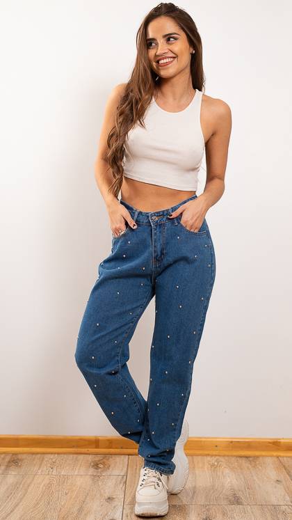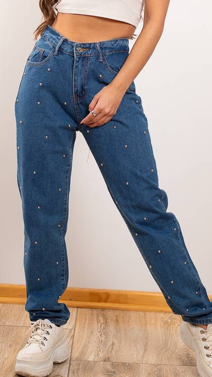 DESCRIPCIÓN: JEANS DE TIRO ALTO CON DETALLES DE TACHAS EN LA PARTE DELANTERA, JEANS TELA RIGIDA.