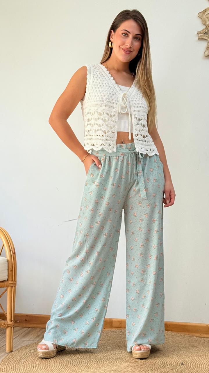 Palazzo de tela suave y fluida, ideal para días cálidos. Su calce es relajado, con pretina elasticada y lazo ajustable que brinda comodidad y un toque femenino. El diseño presenta pequeñas flores distribuidas en toda la prenda, aportando un aire fresco y primaveral. Perfecto para combinar con tops tejidos o blusas livianas y lograr un look casual y chic.