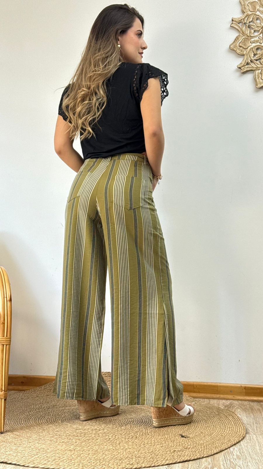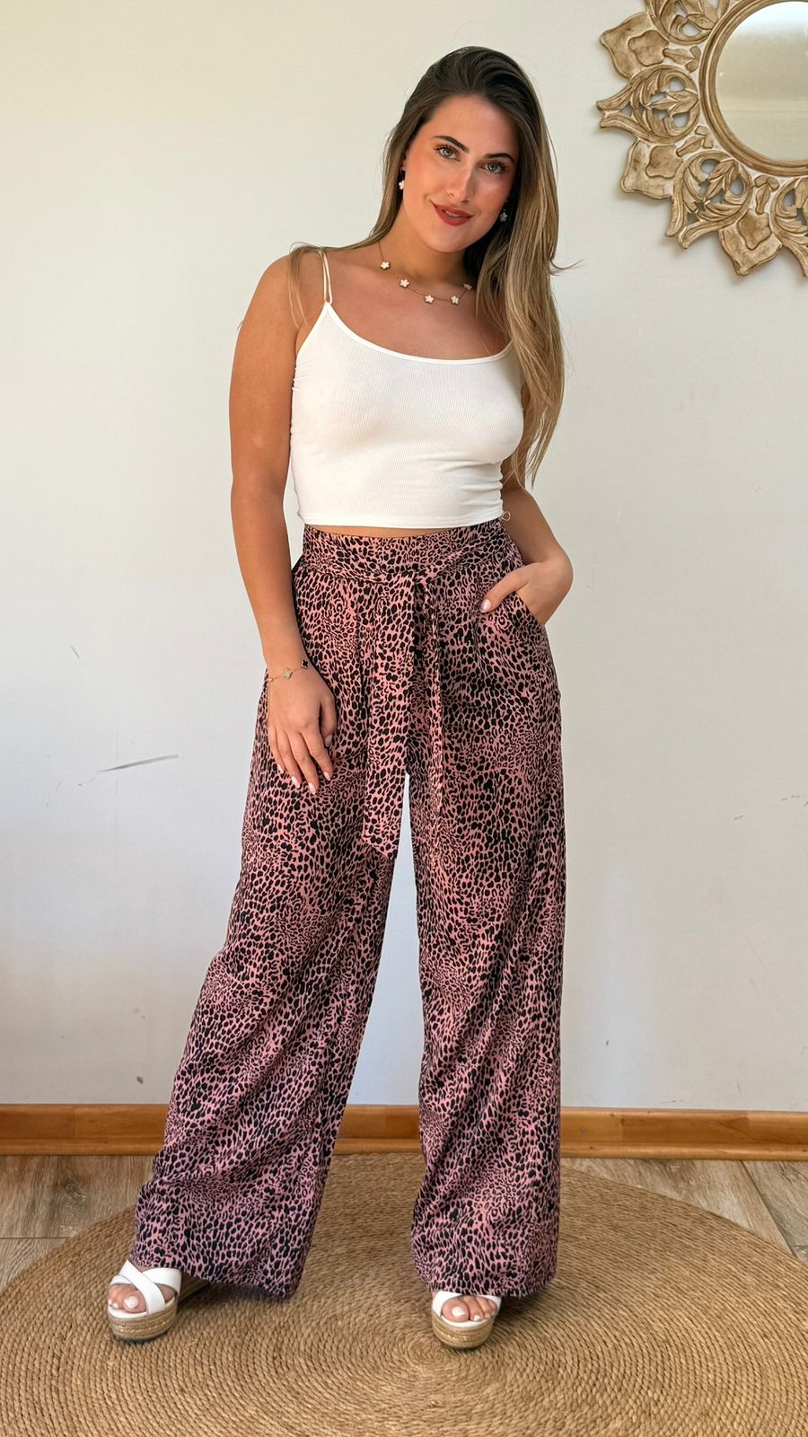DESCRIPCION: PALAZZO DE TELA LIVIANA CON CINTURA ELASTICADA EN LA PARTE TRASERA Y LAZO PARA AJUSTAR.
