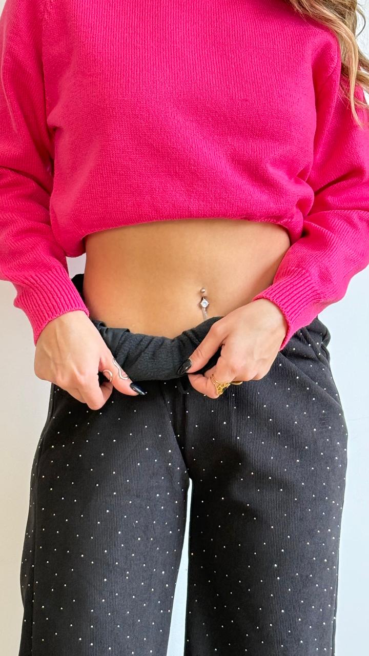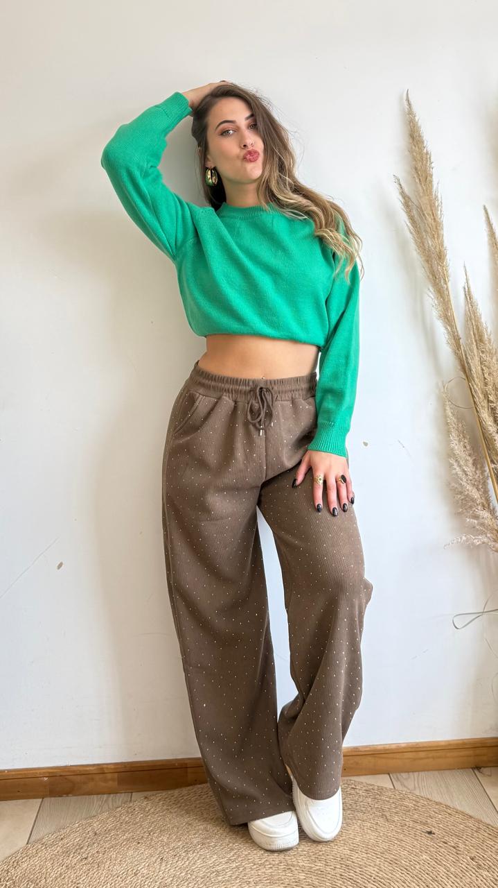 Pantalón con brillos forrado, estilo buzo con cintura elastizada y bolsillos, ideal para los días más fríos.