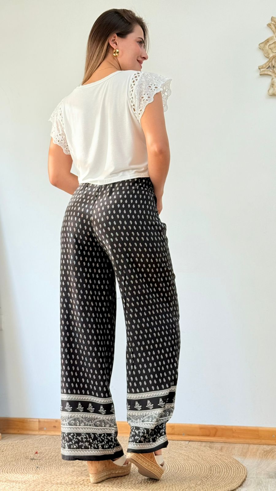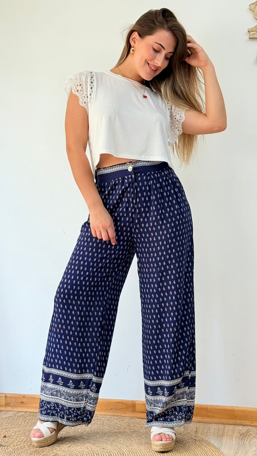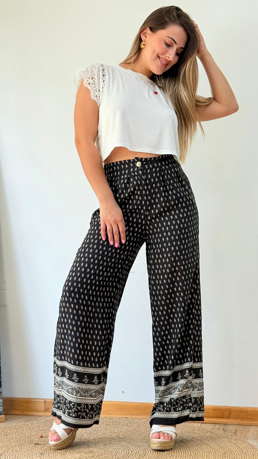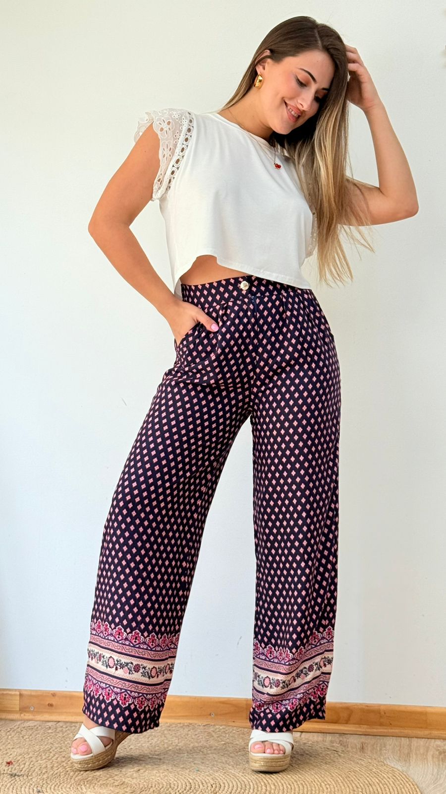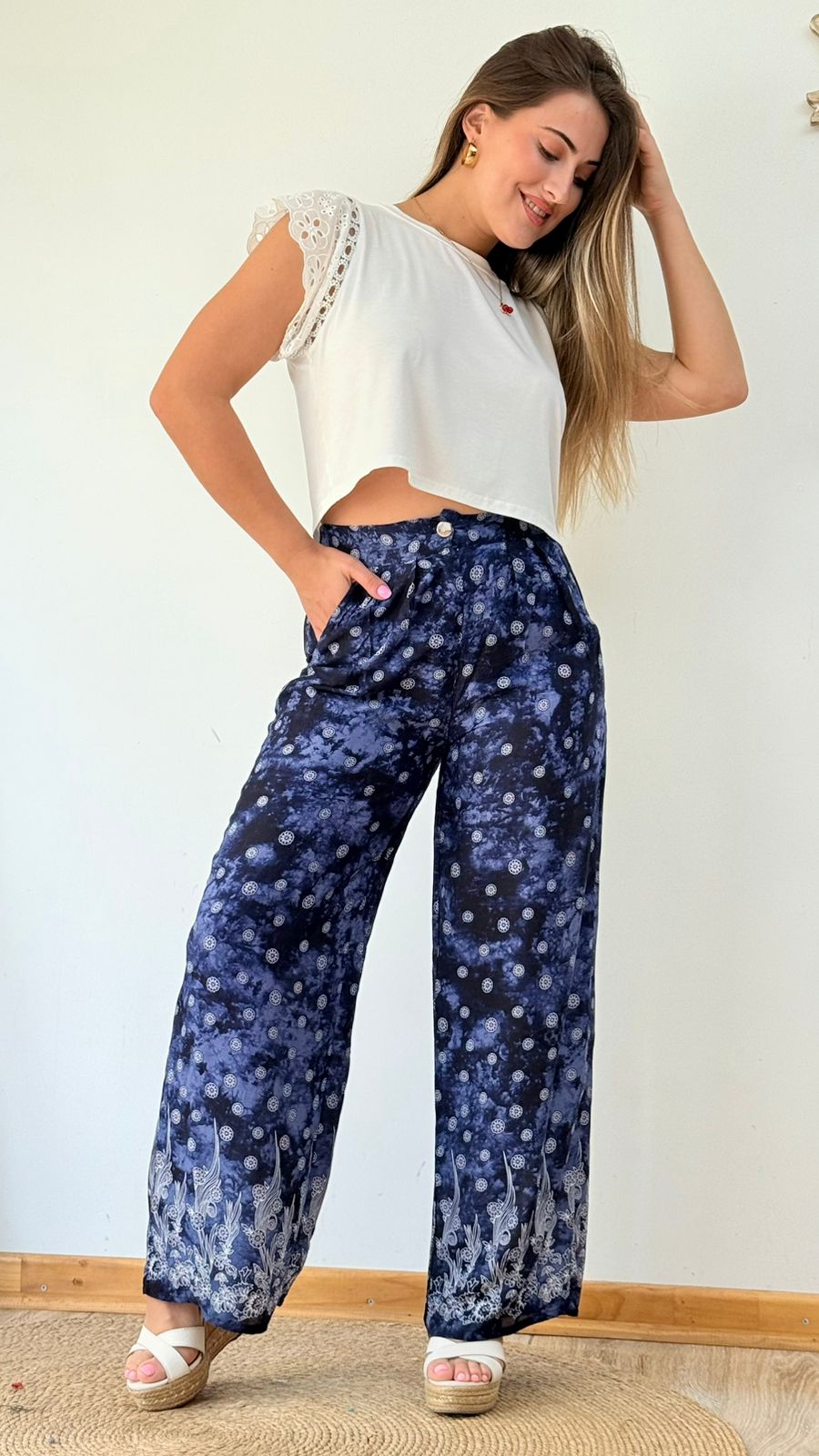 DESCRIPCION: PANTALON ESTAMPADO DE TELA LIVIANA, CORTE RECTO, CINTURA ELASTICADA CON BOTON Y CIERRE, TIENE BOLSILLOS LATERALES. DOS TIPOS DE DISEÑO.