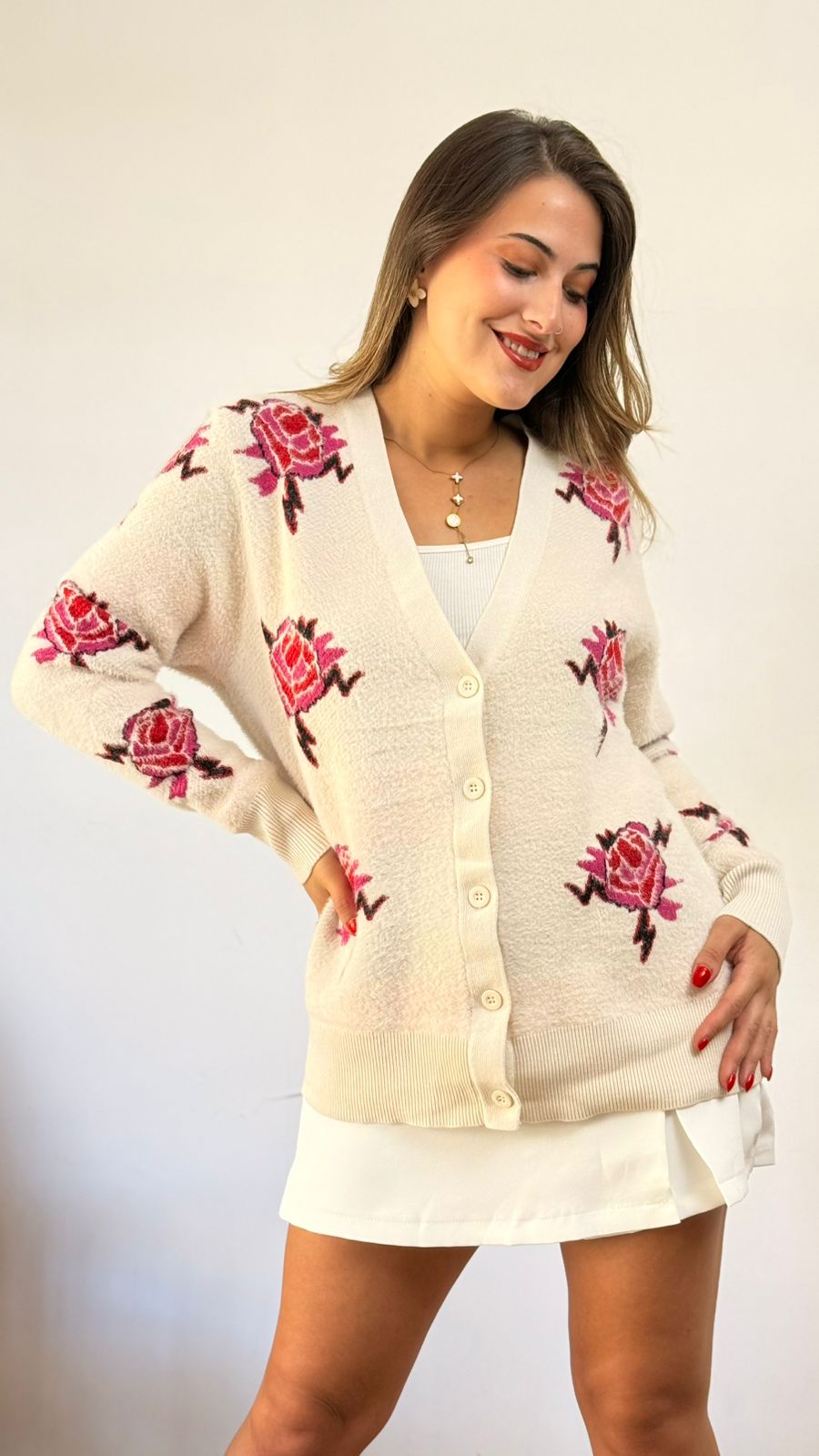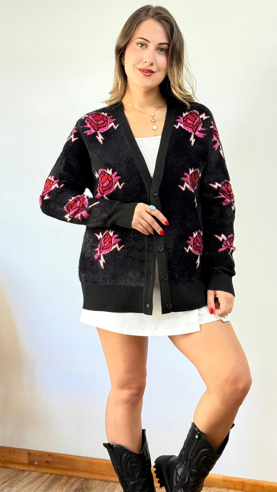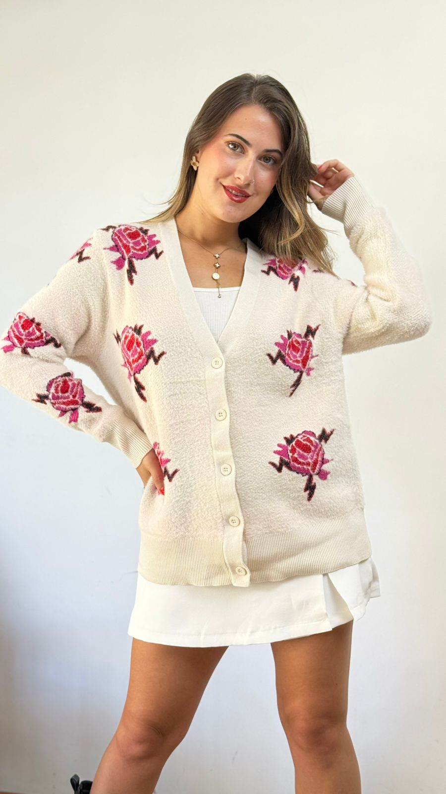 DESCRIPCION: CARDIGAN DE TELA ELASTICADA CON DISEÑO FLORES .