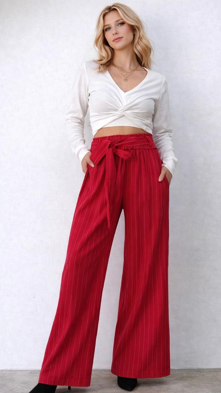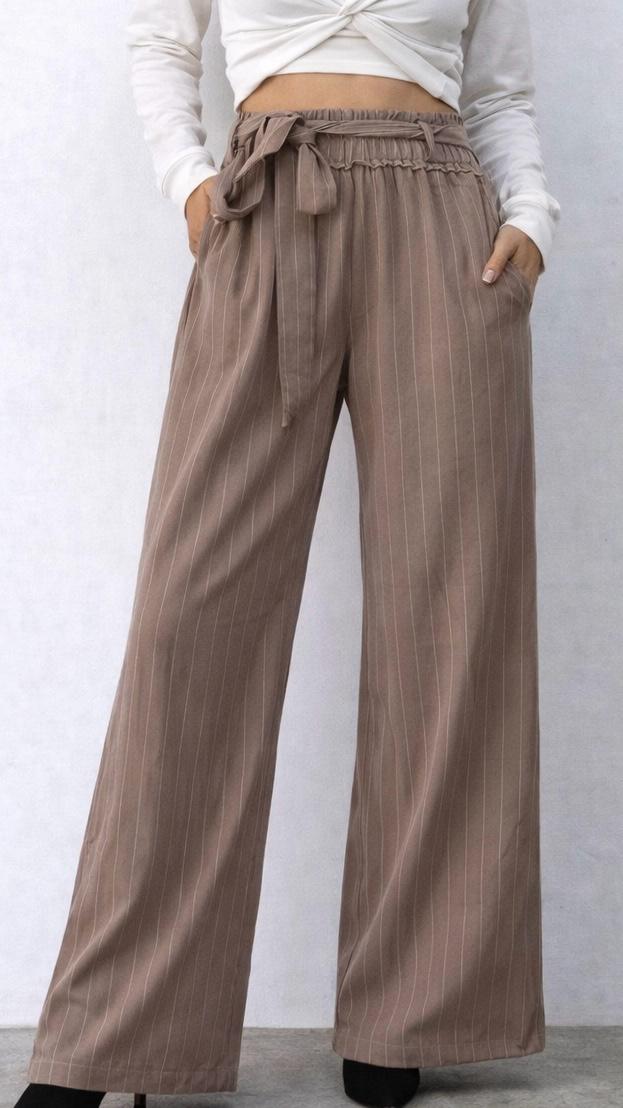 DESCRIPCIÓN: PANTALON DE TELA CON CAIDA RECTA Y DISEÑO LINEAS FINAS Y LAZO PARA AJUSTAR.