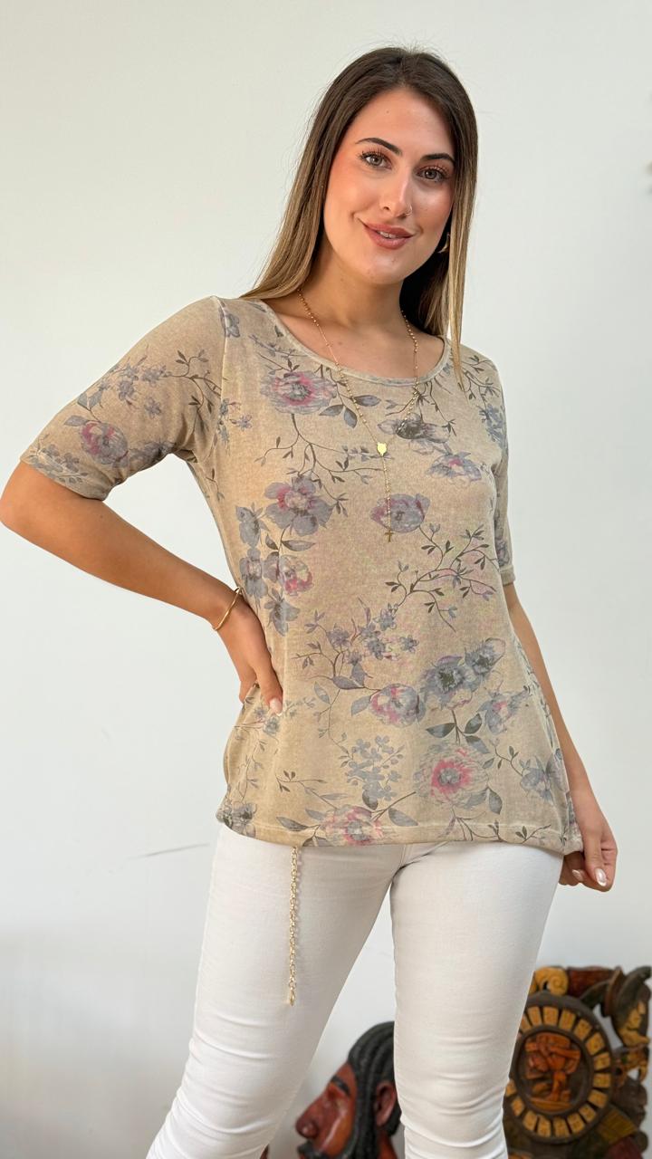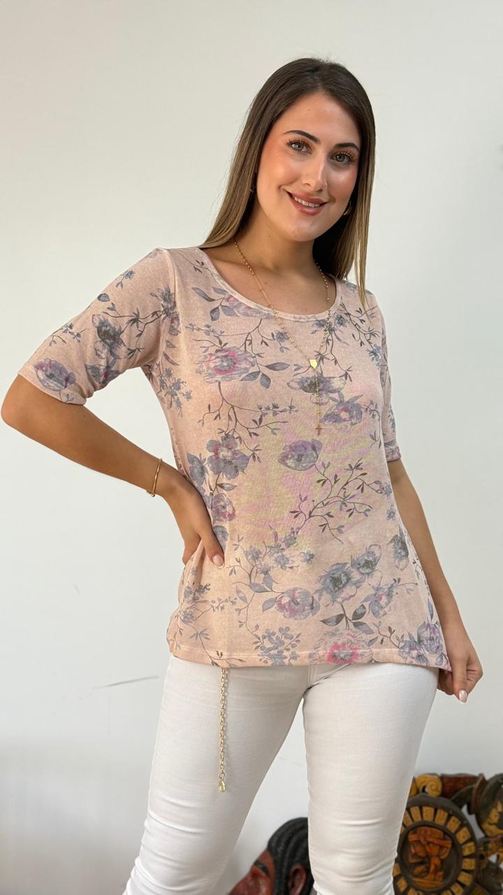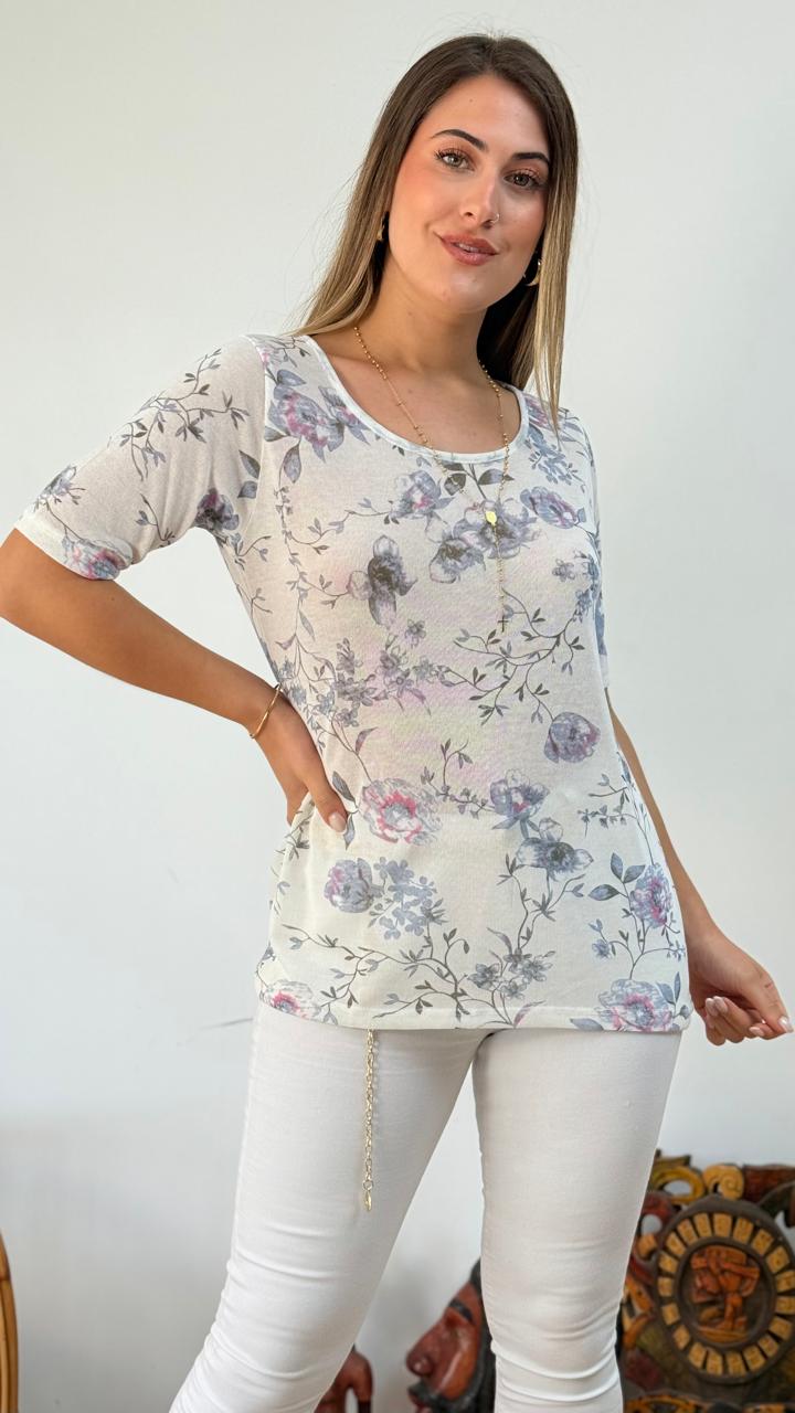 DESCRIPCION: POLERA CUELLO REDONDO DE TELA DELGADA TIPO HILO CON ESTAMPADO FLORES.