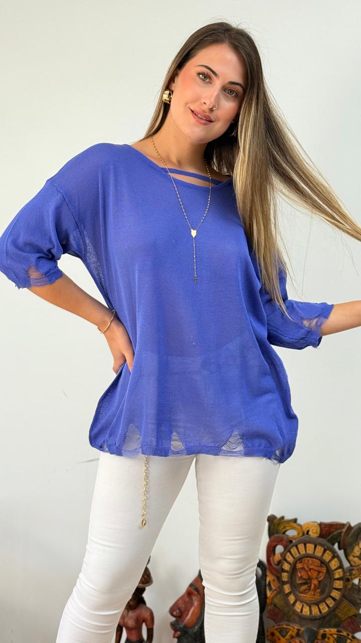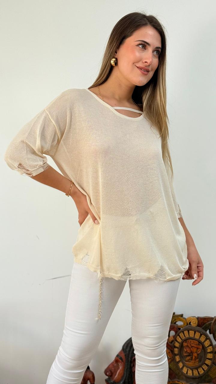 DESCRIPCION: POLERA SEMITRANSPARENTE DE TELA TIPO HILO DELGADO CON DETALLES GASTADOS.