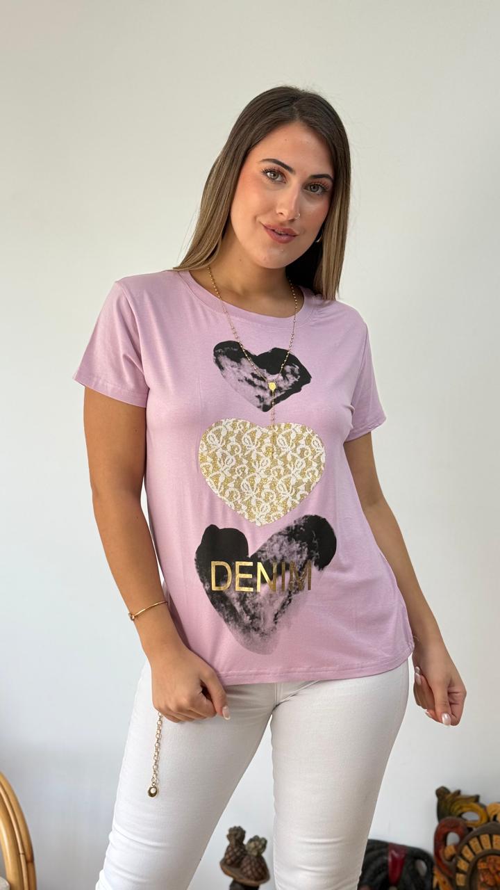 DESCRIPCION: POLERA CUELLO REDONDO DE TELA ELASTICADA Y LIVIANA, PRESENTA ESPAMPADO DE CORAZONES EN EL CENTROE EN COLOR NEGRO Y DORADO, DE ESTILO CASUAL Y COMODO.