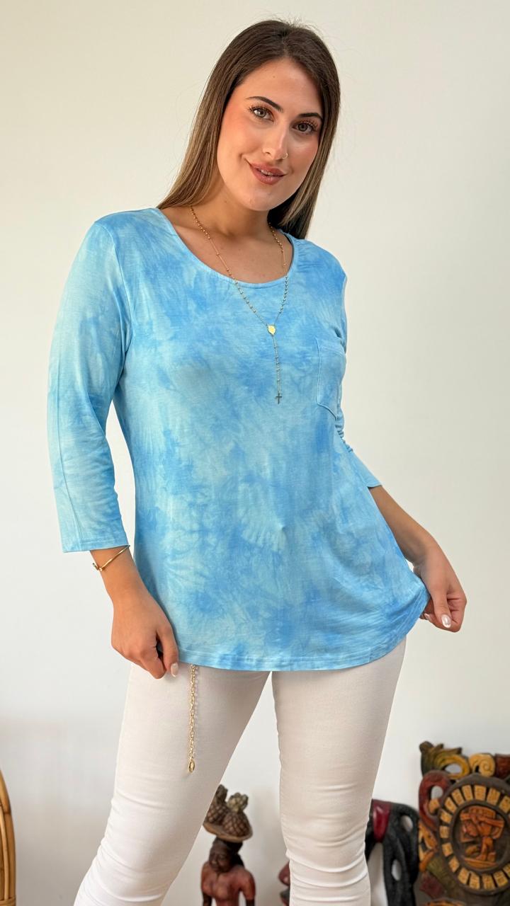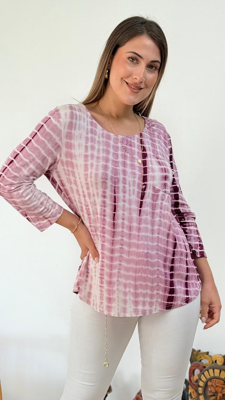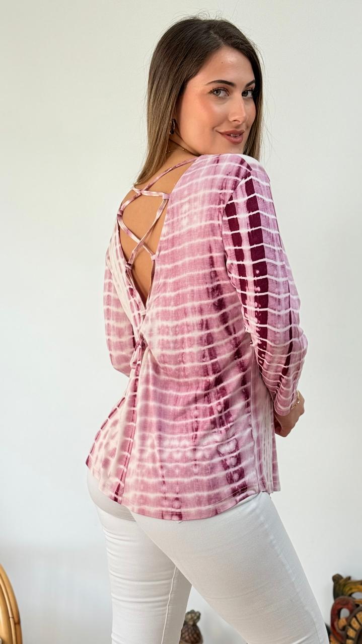 DESCRIPCION: POLERA DE CUELLO REDONDO CON MANGA 3/4, PRESENTA DETALLE CRUZADO EN ESPALDA Y DISEÑO DEGRADE, TELA ELASTICADA Y LIVIANA.