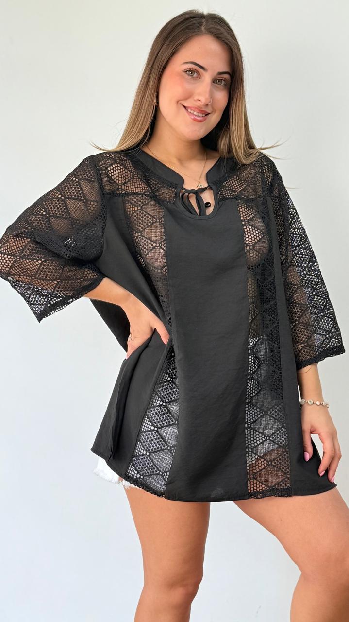 Polera oversize en color con delicados detalles de encaje en mangas y costados. Una prenda fresca, femenina y versátil, ideal para el día a día o para combinar en un look más elegante.