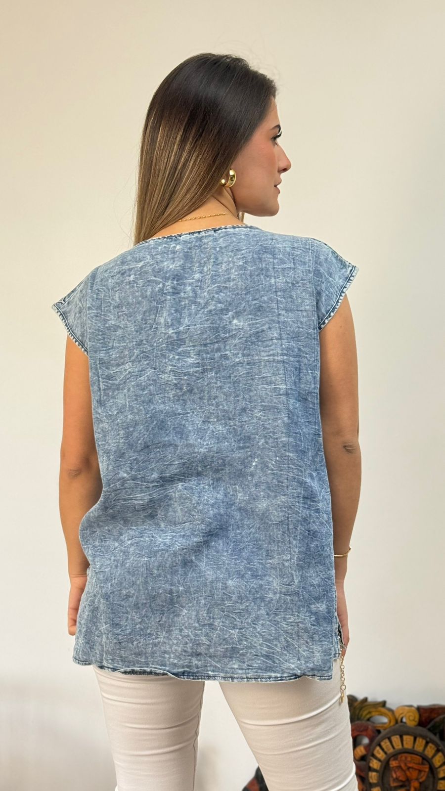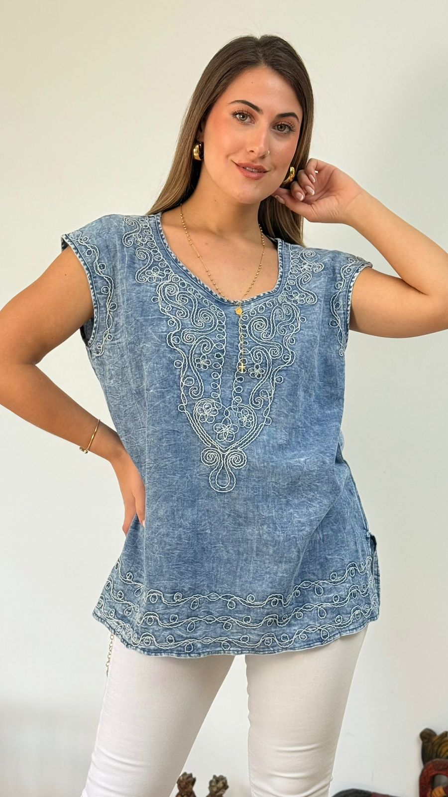 Blusa de estilo artesanal con un toque bohemio, confeccionada en tela tipo denim liviano con efecto desgastado. Destaca por sus bordados decorativos en el cuello, pecho y basta, que realzan el diseño y aportan un aire femenino y sofisticado.