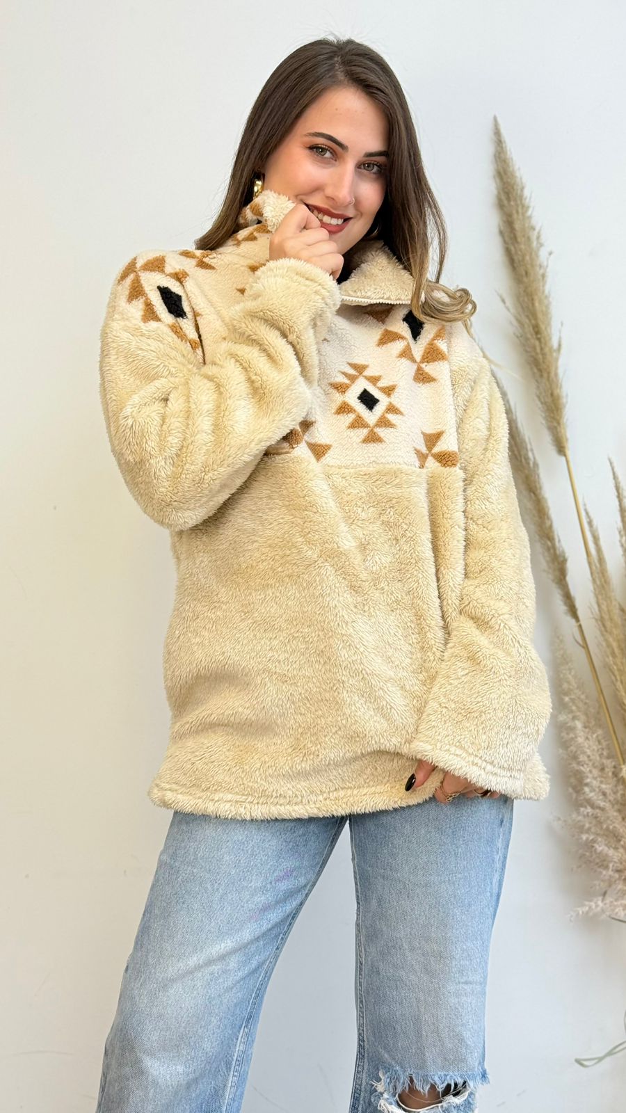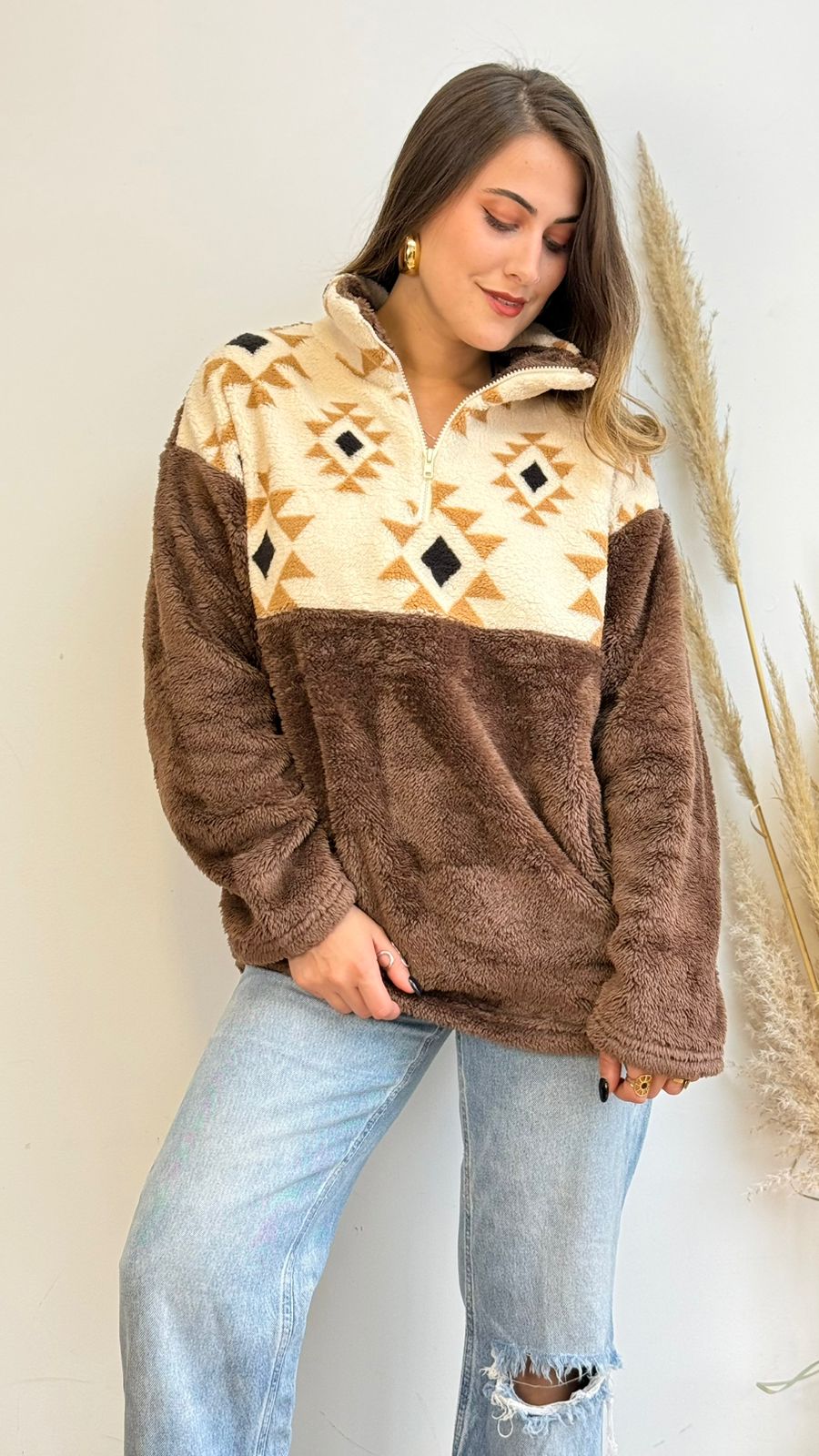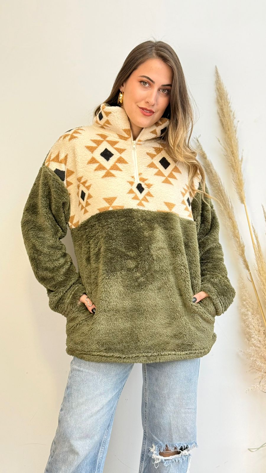 Polerón diseño étnico de tela tipo polar, presenta medio cierre y bolsillos , ideal para los días más fríos.