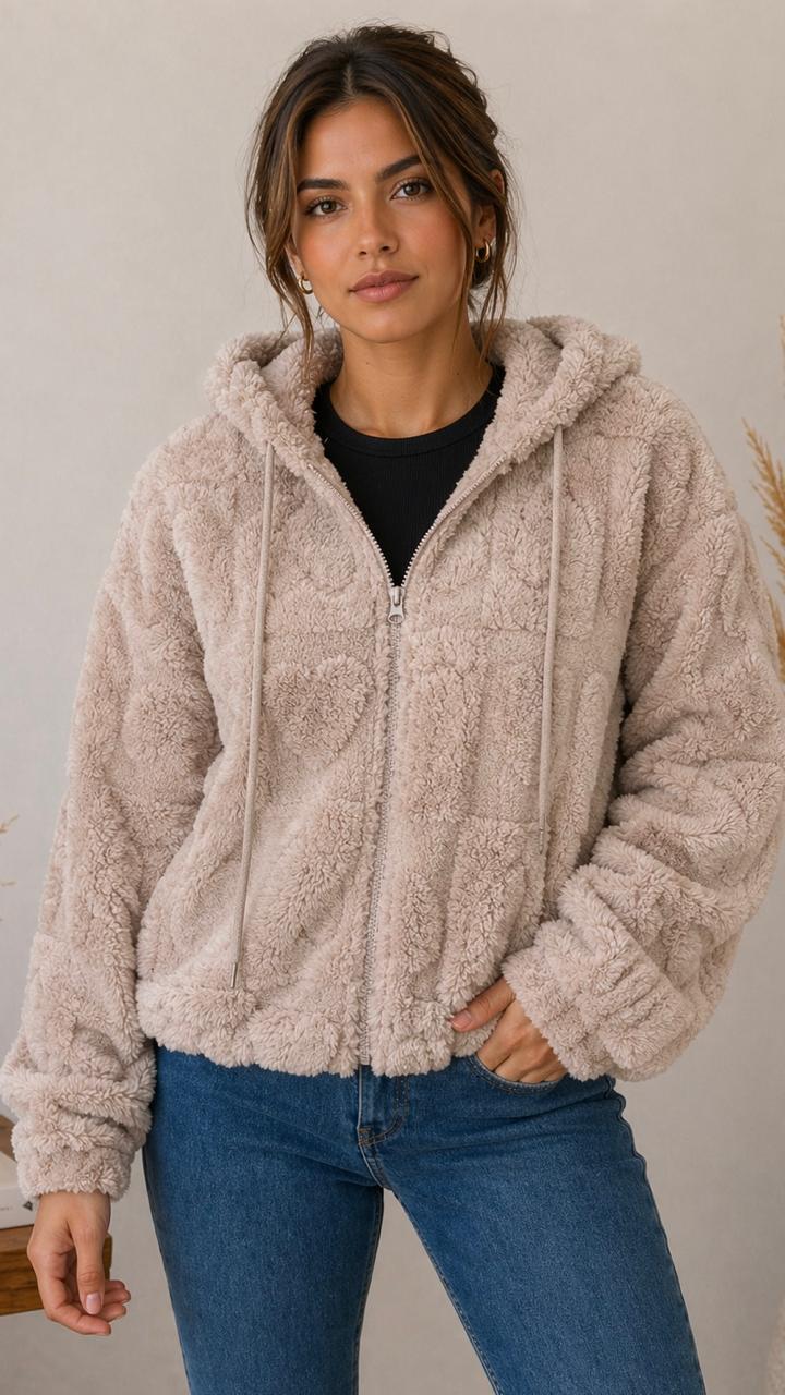 Polerón chiporro o sherpa con capucha y cierre frontal, tiene bolsillos y es elasticado en puños y en el borde inferior, ideal para los días más fríos.