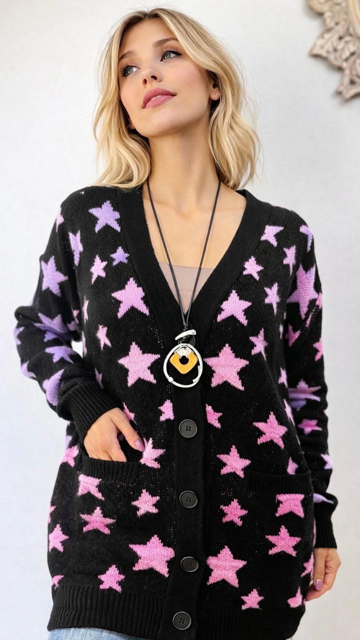DESCRIPCIÓN: CARDIGAN DE TELA TIPO LANA CON DISEÑO ESTRELLAS Y BOTONES.