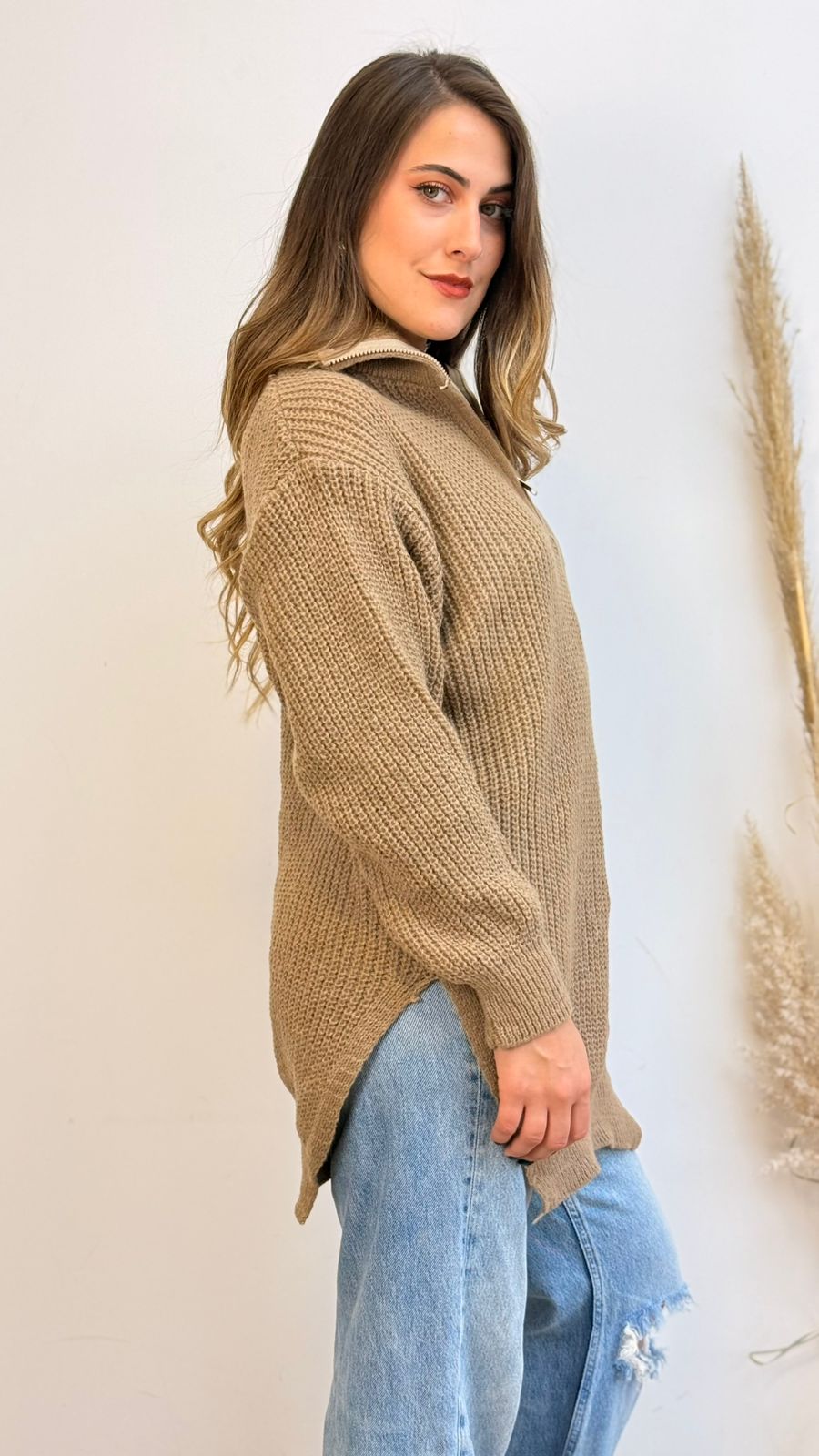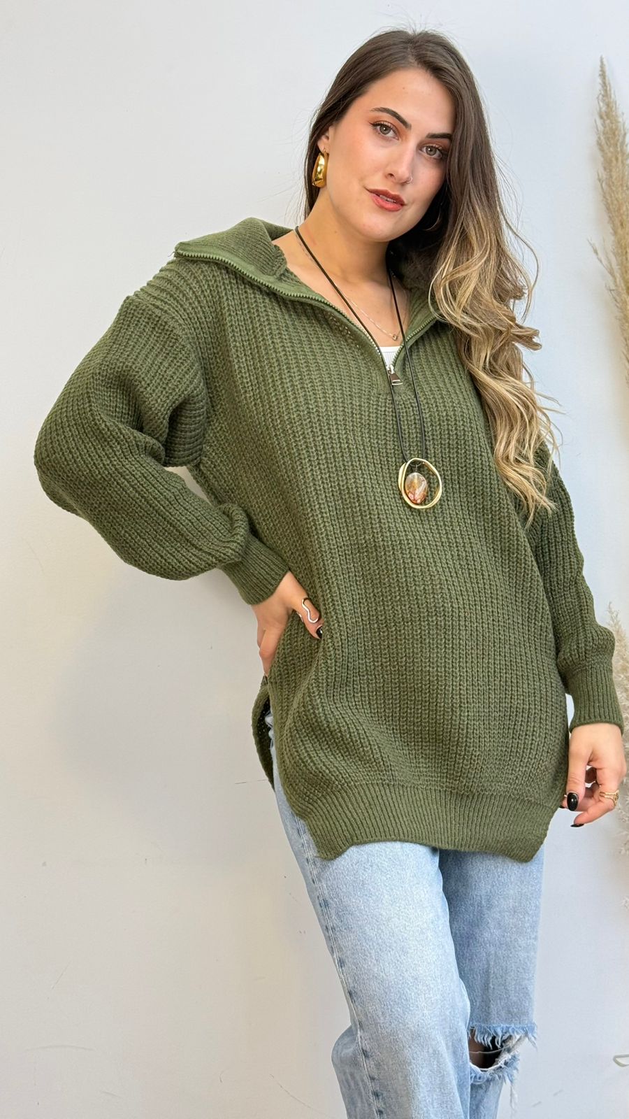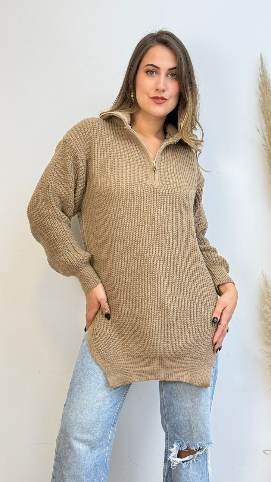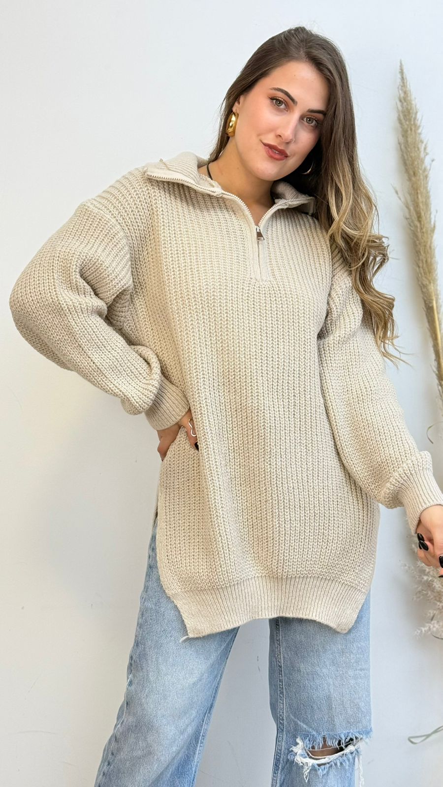 Suéter de tela tipo lana, presenta medio cierre, corte holgado y con abertura a los costados, ideal para los días más fríos.