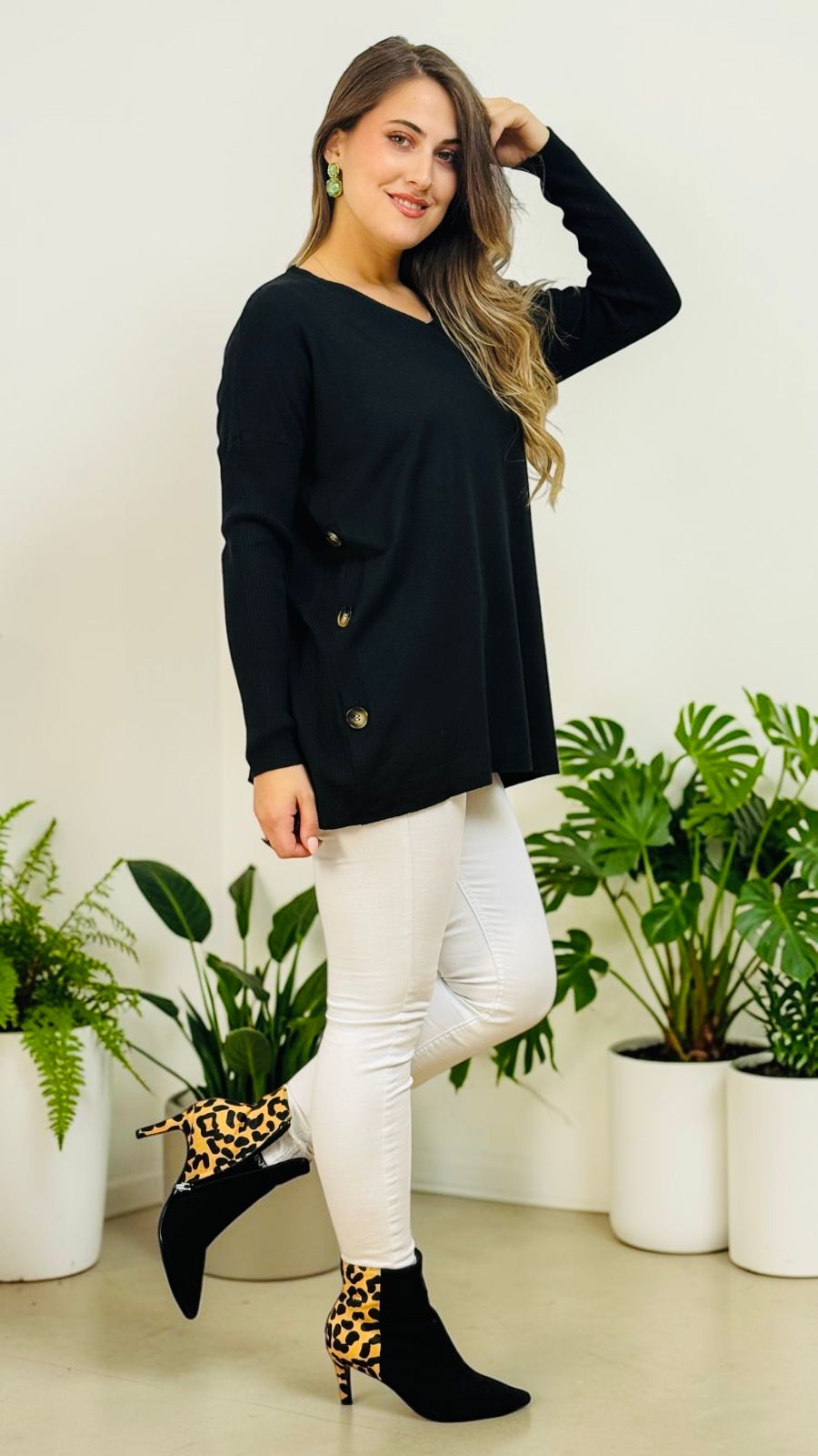 Suéter de tela spandex, holgado, cuello v y botones de adornos en los costados. Calce cómodo y fácil de combinar.