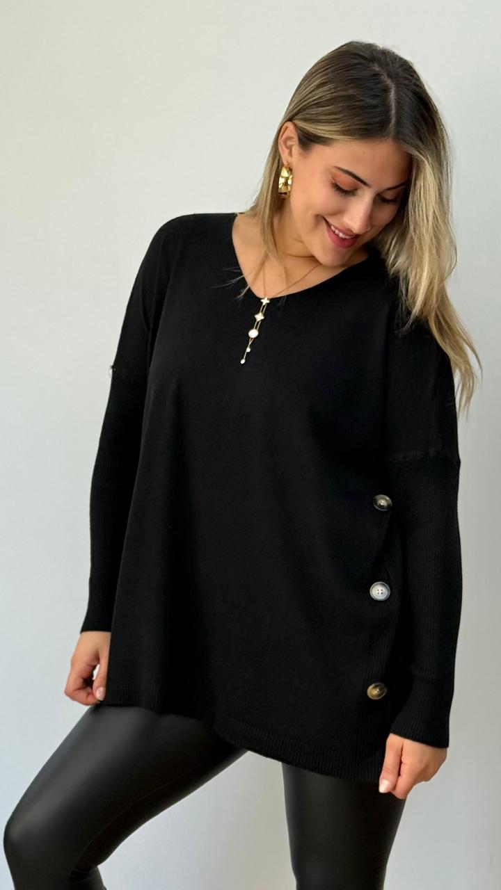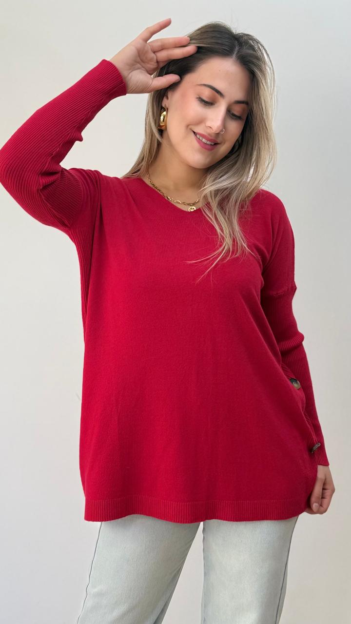 Suéter de tela spandex, holgado, cuello v y botones de adornos en los costados. Calce cómodo y fácil de combinar.