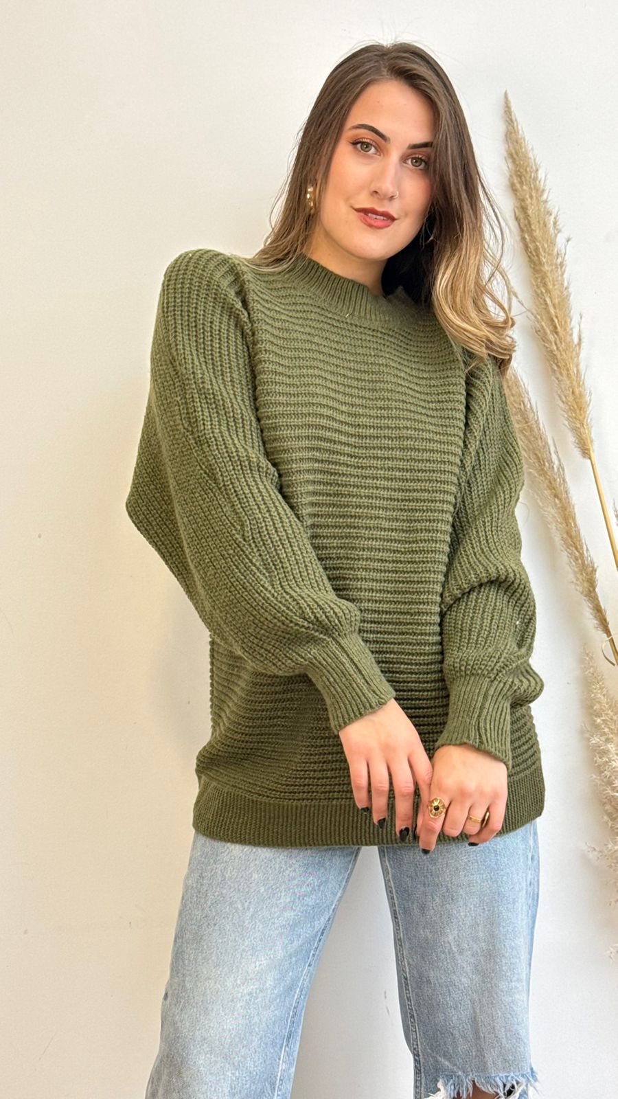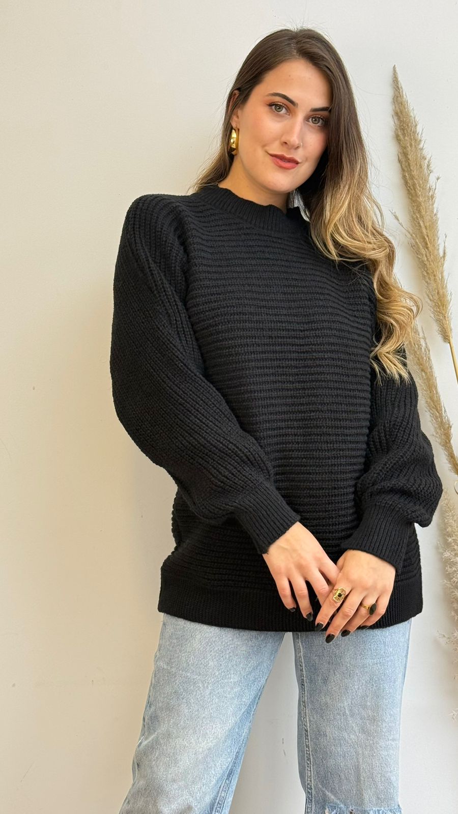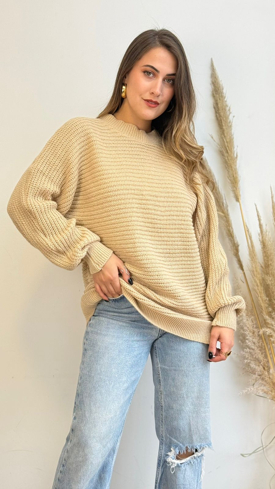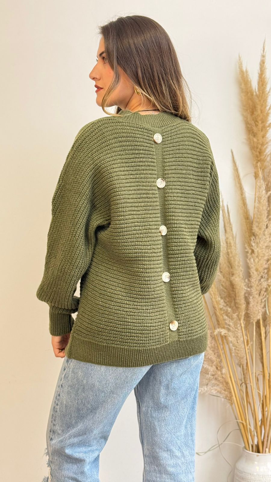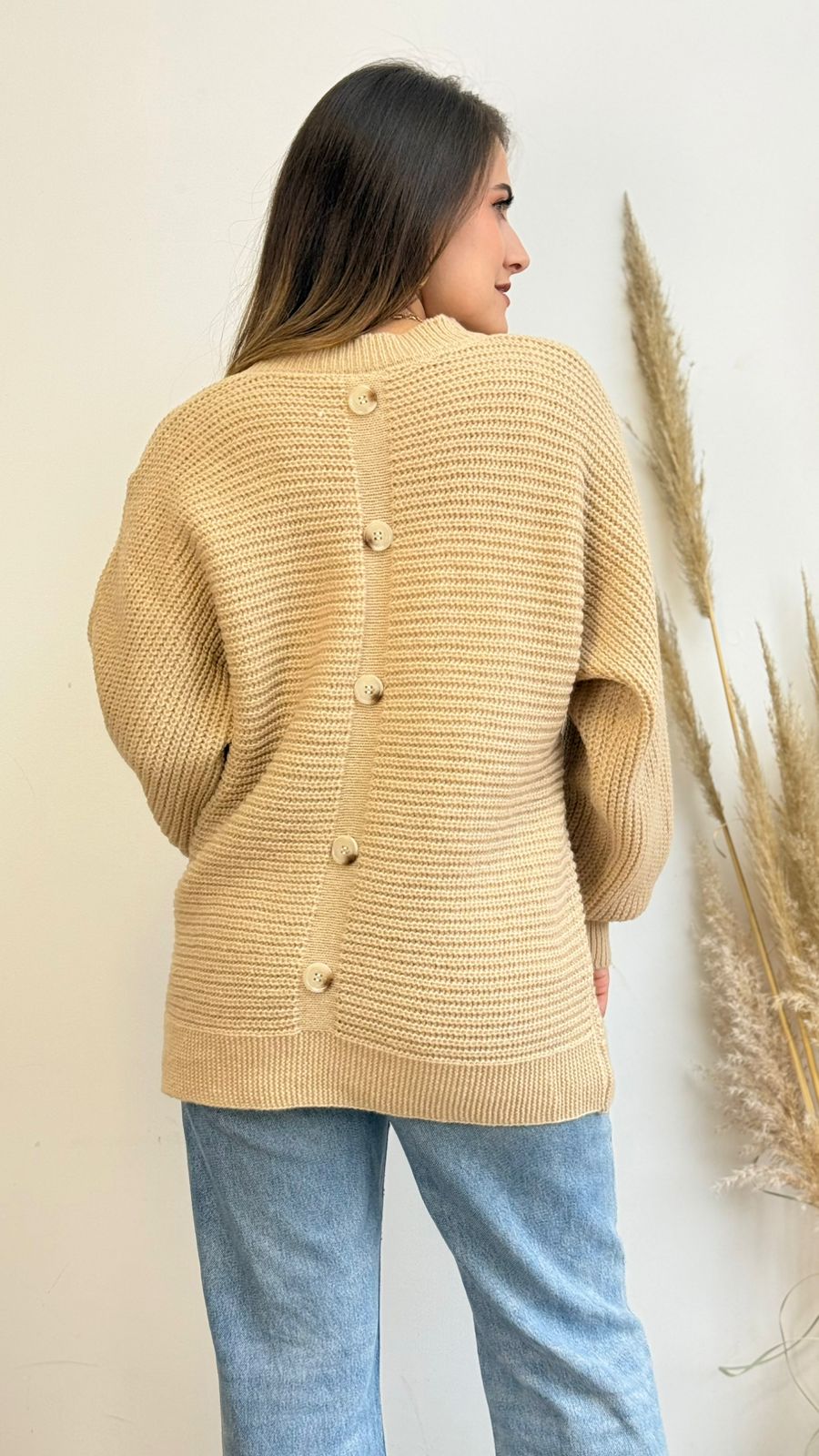 Suéter oversize de tela tipo lana, cuello redondo y botones traseros de adorno, ideal para los días más fríos.