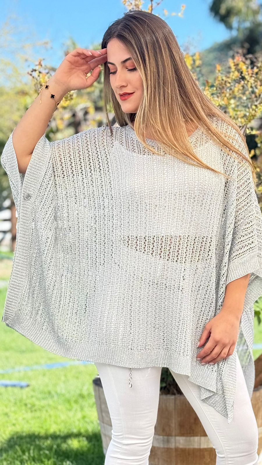 DESCRIPCION: HERMOSO SUETER CALADO TIPO MURCIELADO DE TELA BRILLANTE Y PLATEADA.