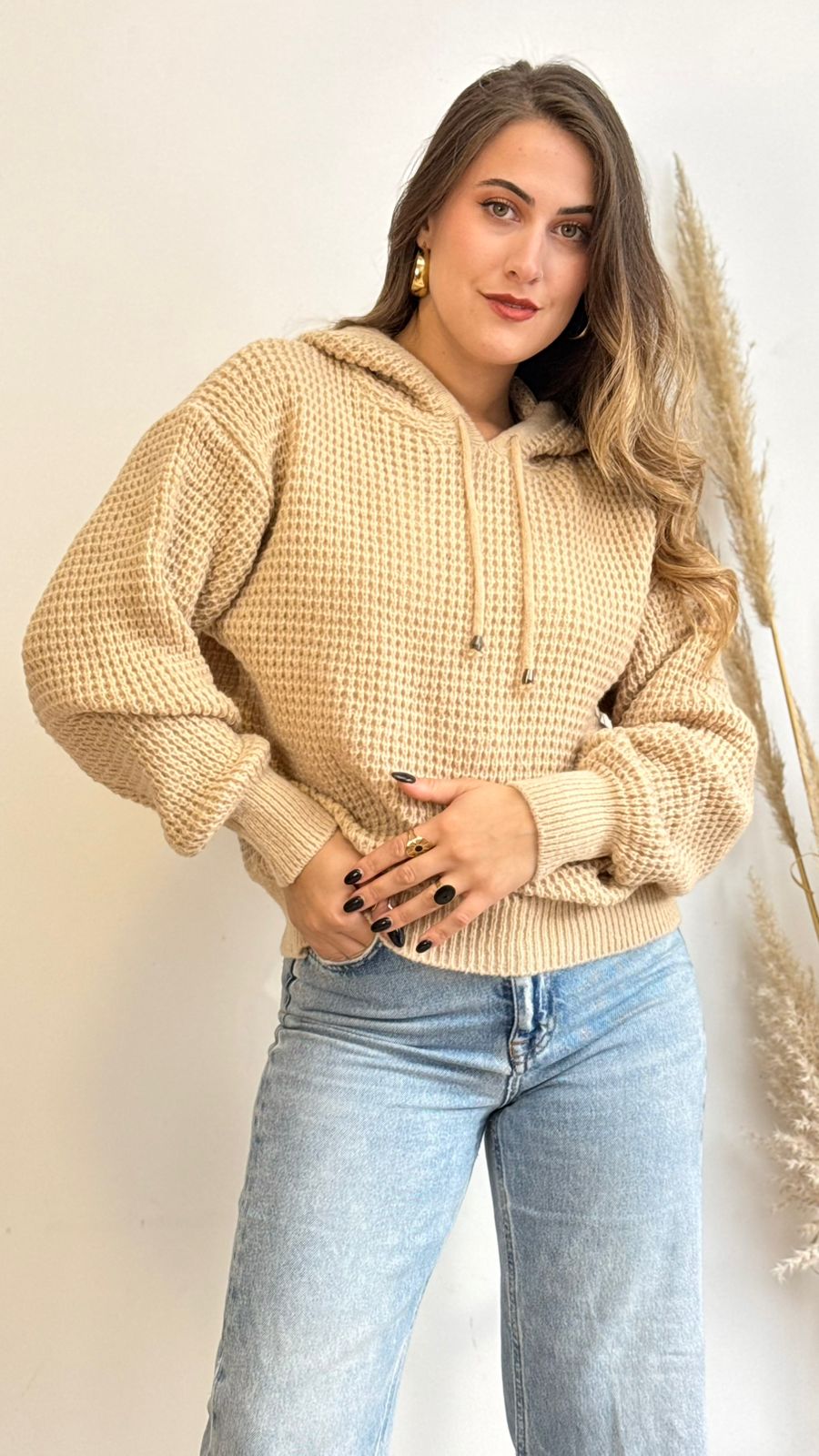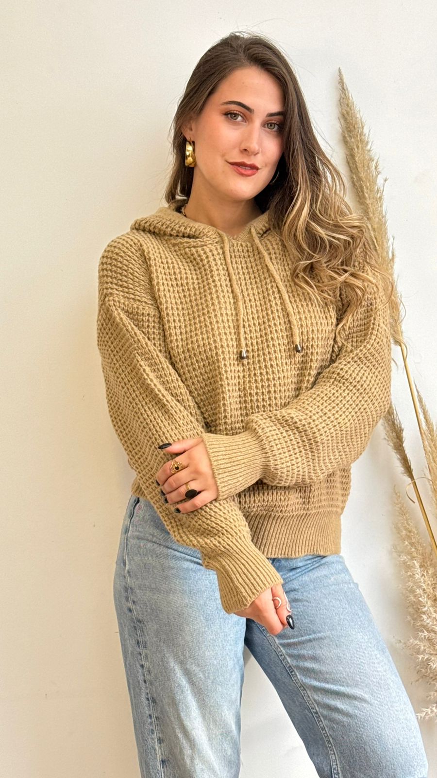 Sueter de tela tipo lana, diseño panal, con capucha, ideal para los días más fríos.