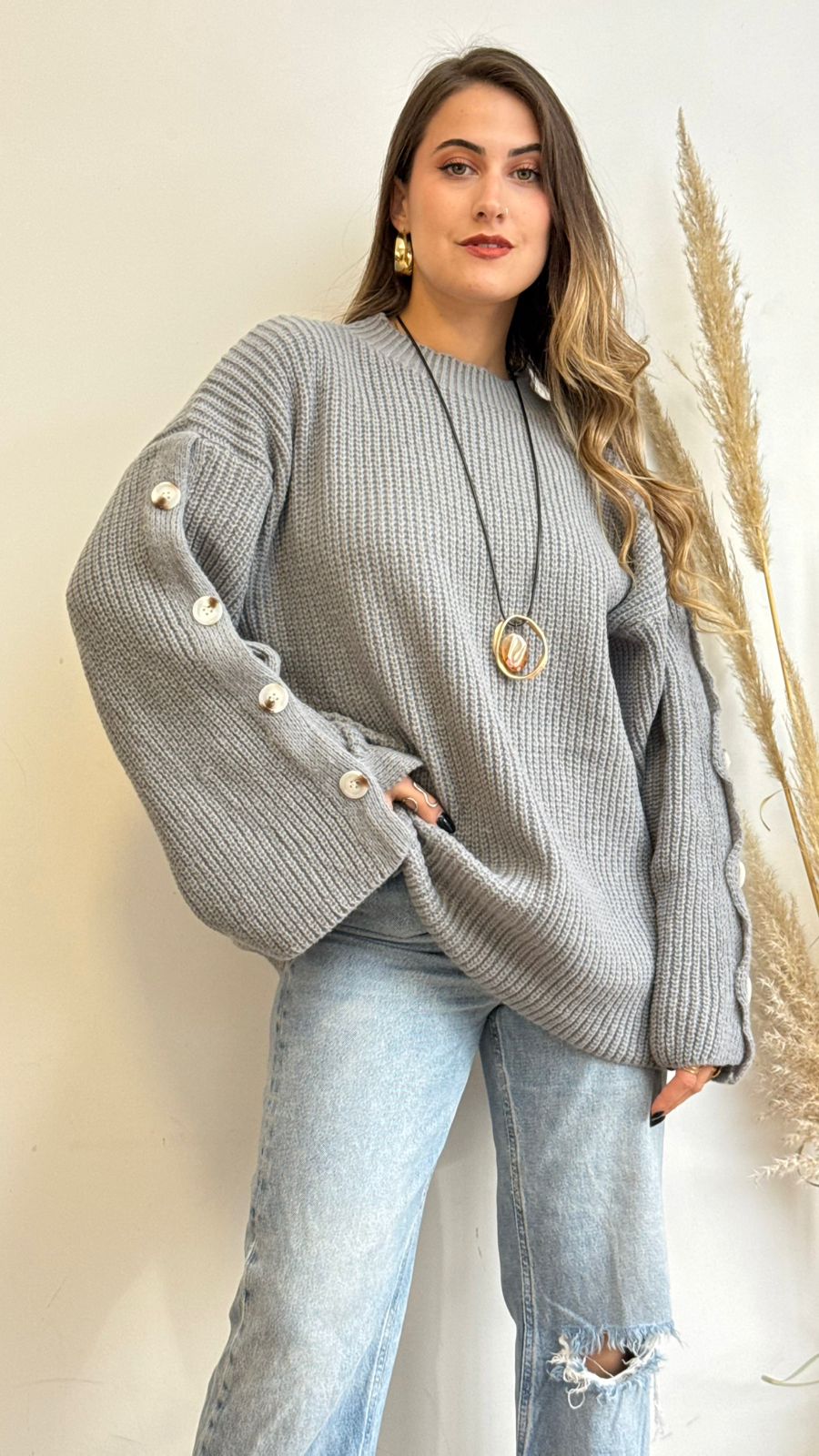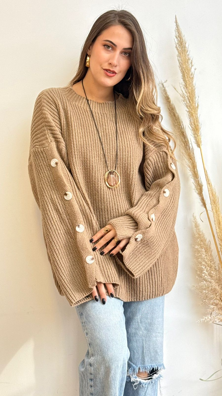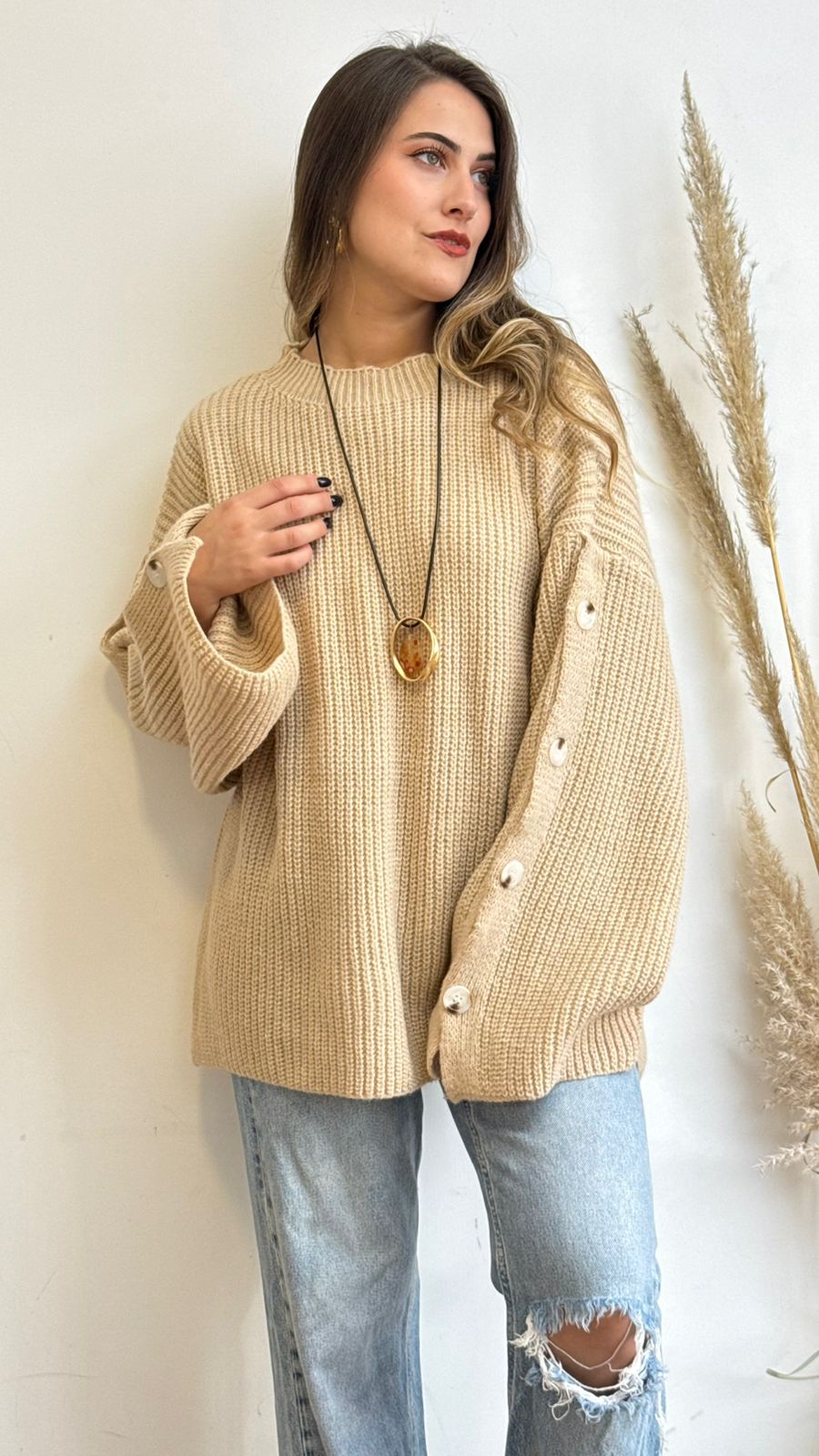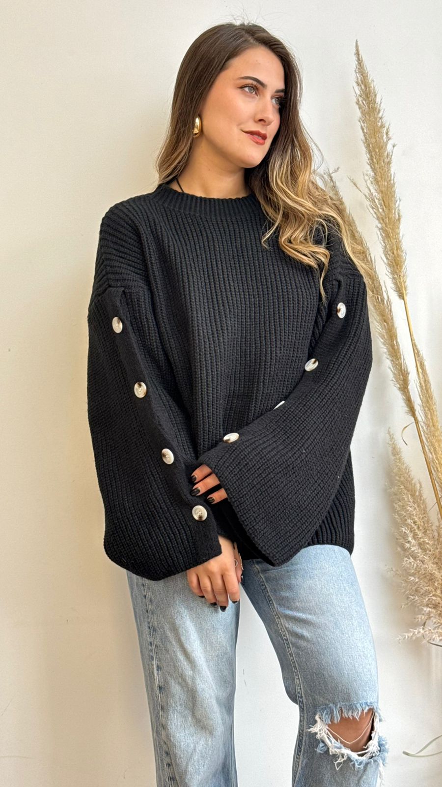 Suéter tipo lana, oversize, cuello redondo y de mangas anchas con detalles botones de adorno, ideal para los días más fríos.