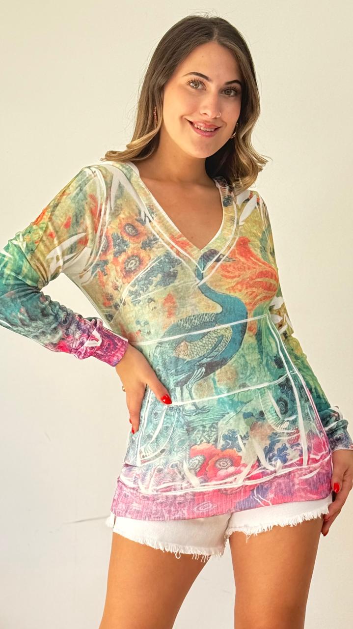 DESCRIPCION: SUETER ELASTICADO CON CAPUCHA Y BOLSILLOS. ESTAMPADO MULTICOLOR ABSTRACTO