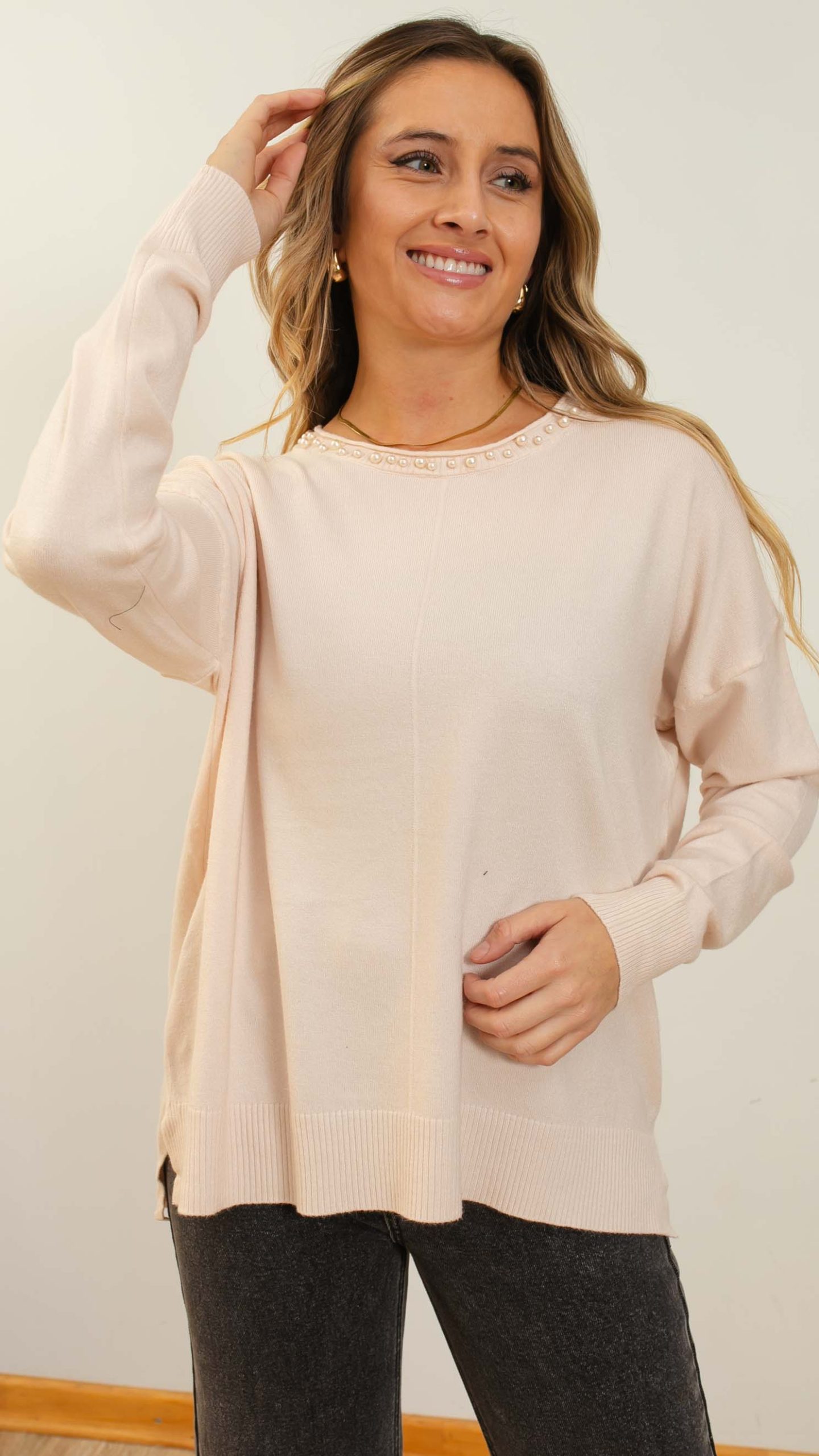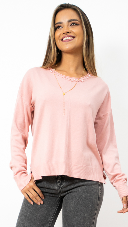 Suéter tela spandex de cuello redondo con pequeñas perlitas. Calce cómodo y fácil de combinar.