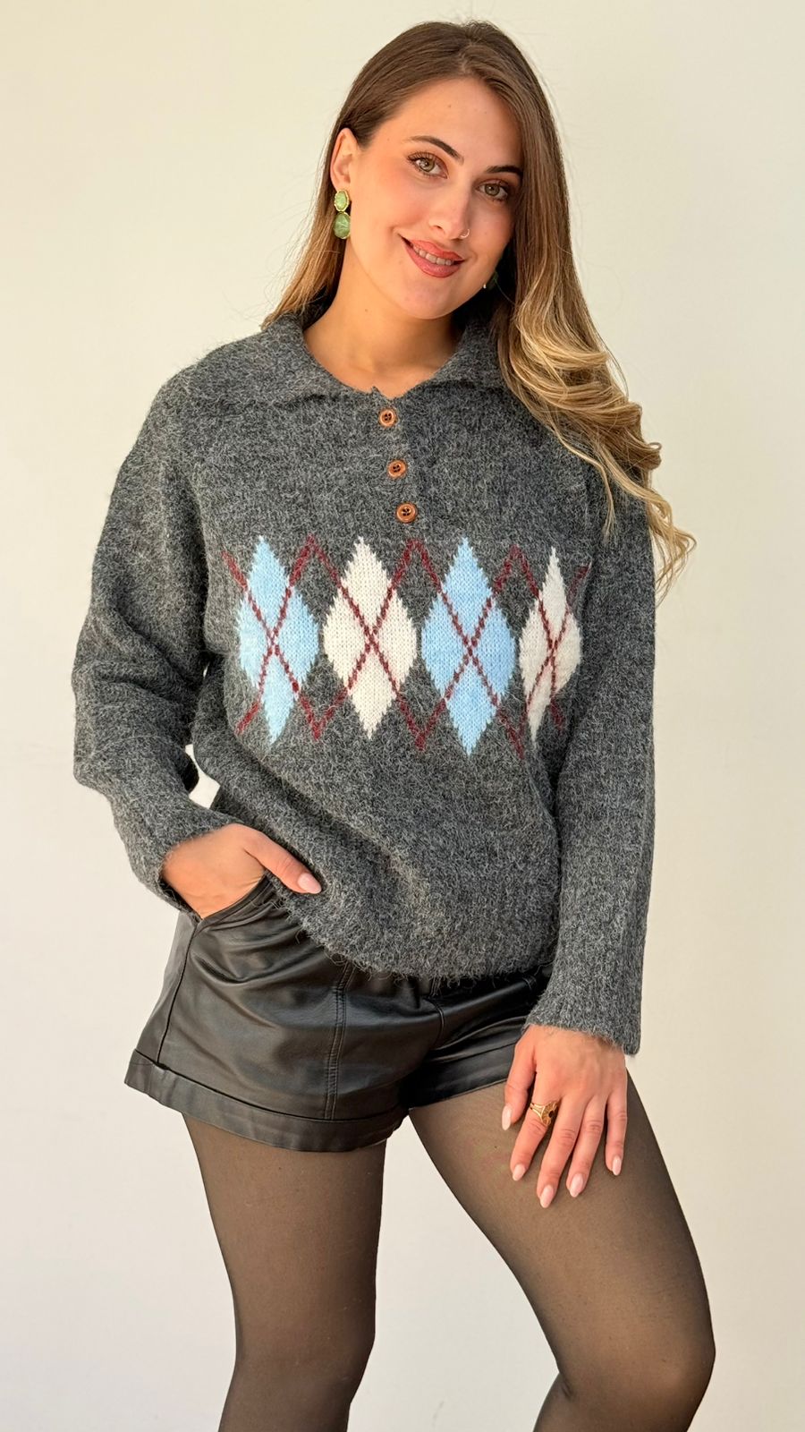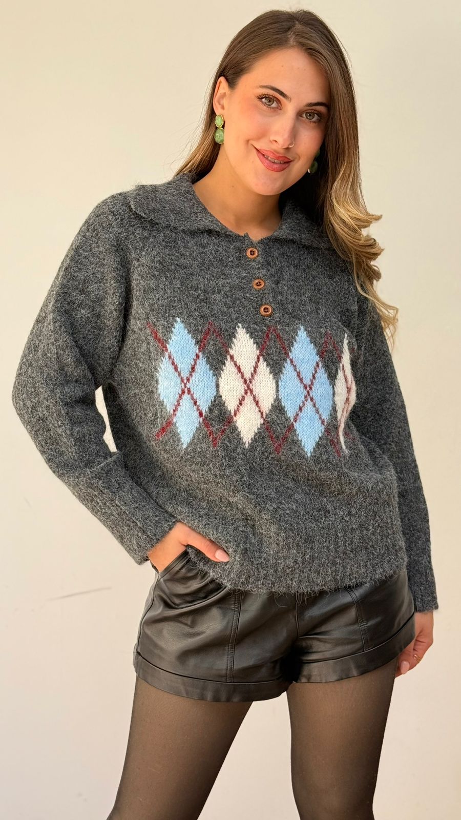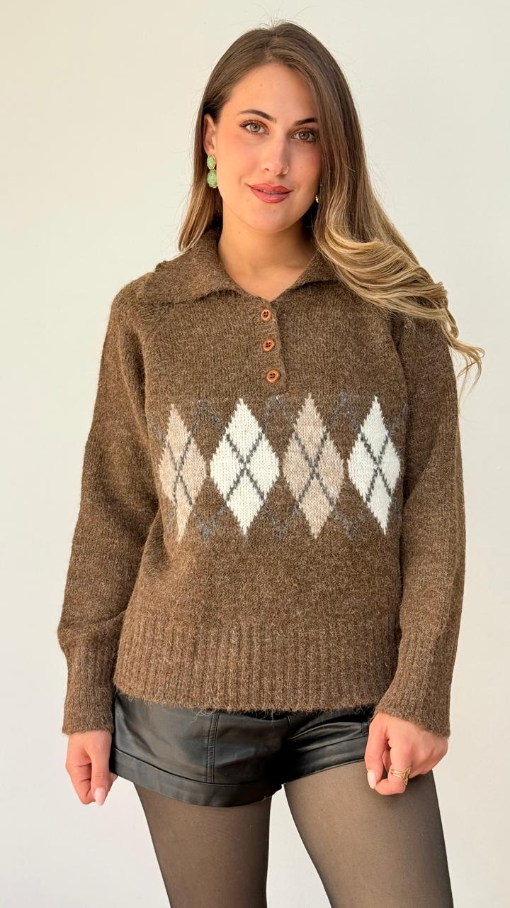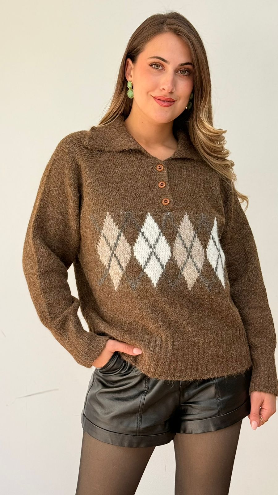 Suéter de mujer con diseño rombos y cuello tipo polo, tela lana suave Calce cómodo y fácil de combinar.