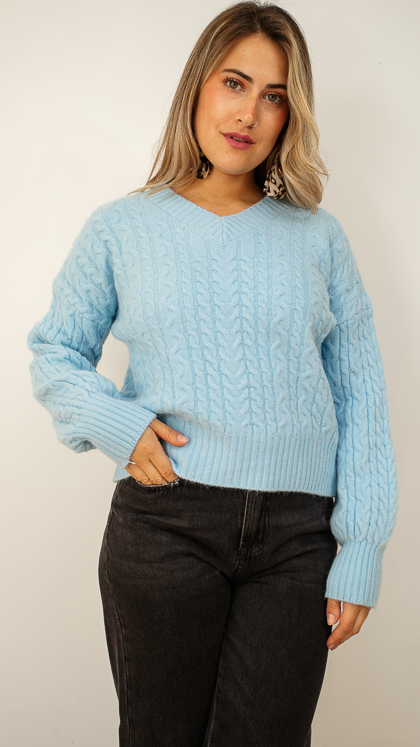 DESCRIPCION: SUETER CUELLO V. TELA GRUESA Y ABRIGADORA CON DISEÑO TRENZADO EN COLOR CELESTE.