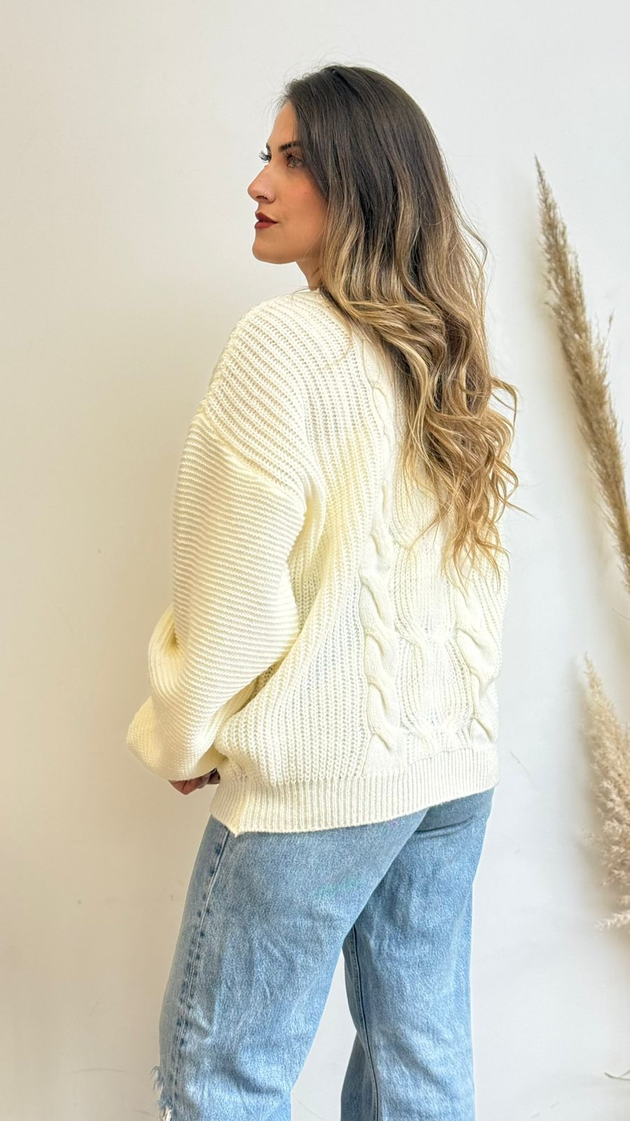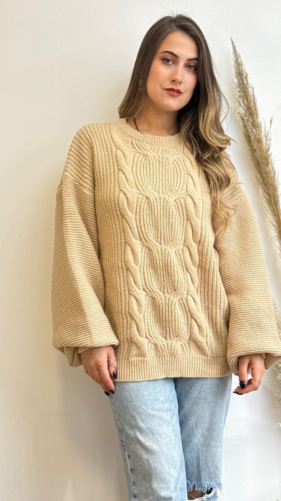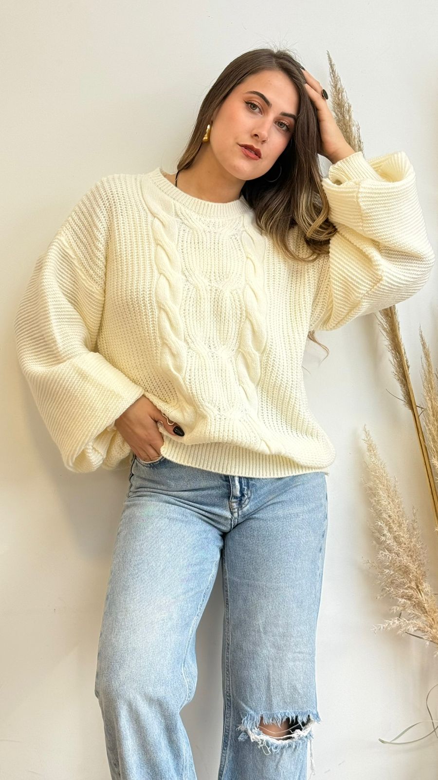 Chaleco tipo lana oversize con diseño trenzado en el centro y con manga ancha, ideal para los días más fríos.