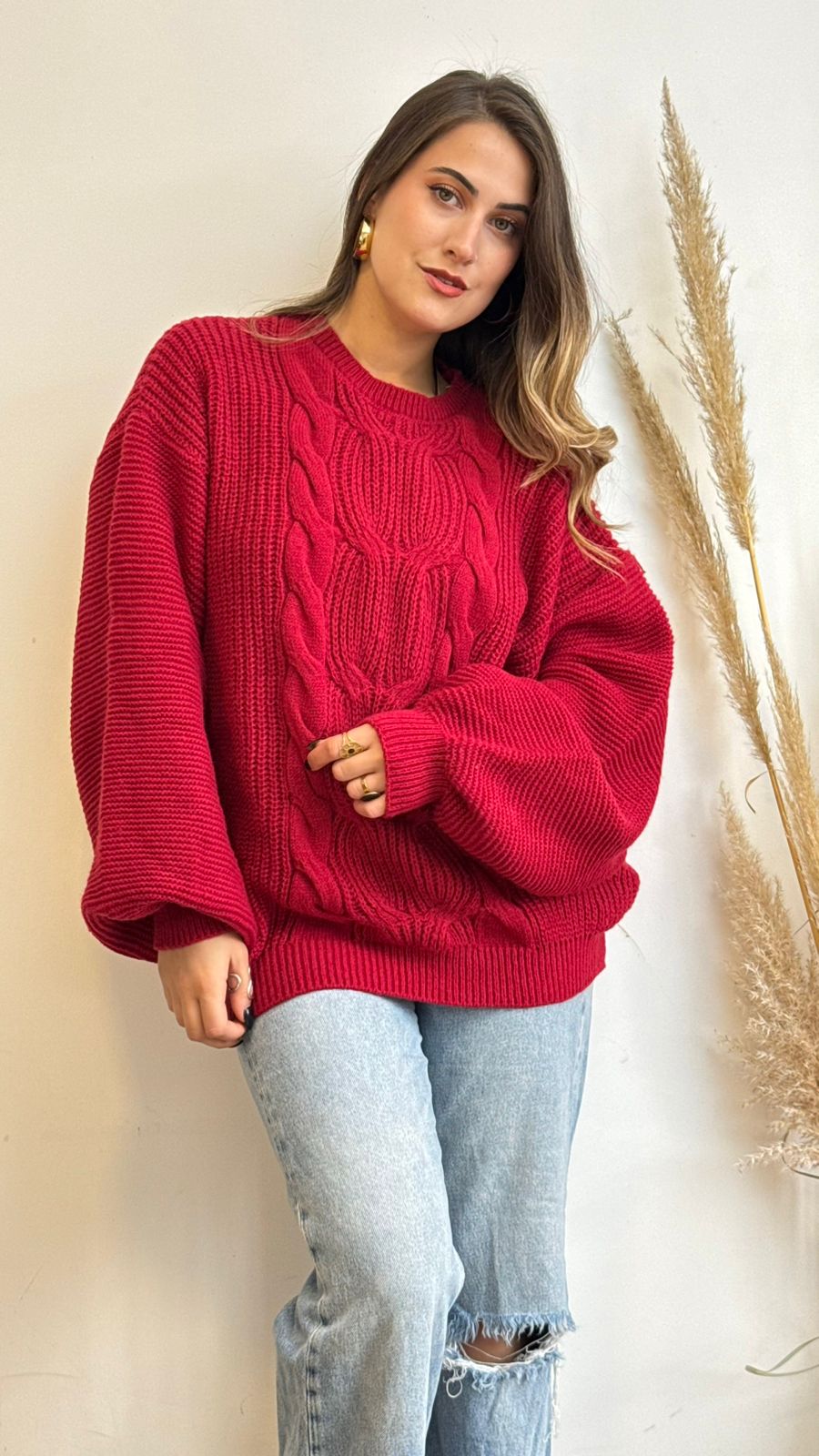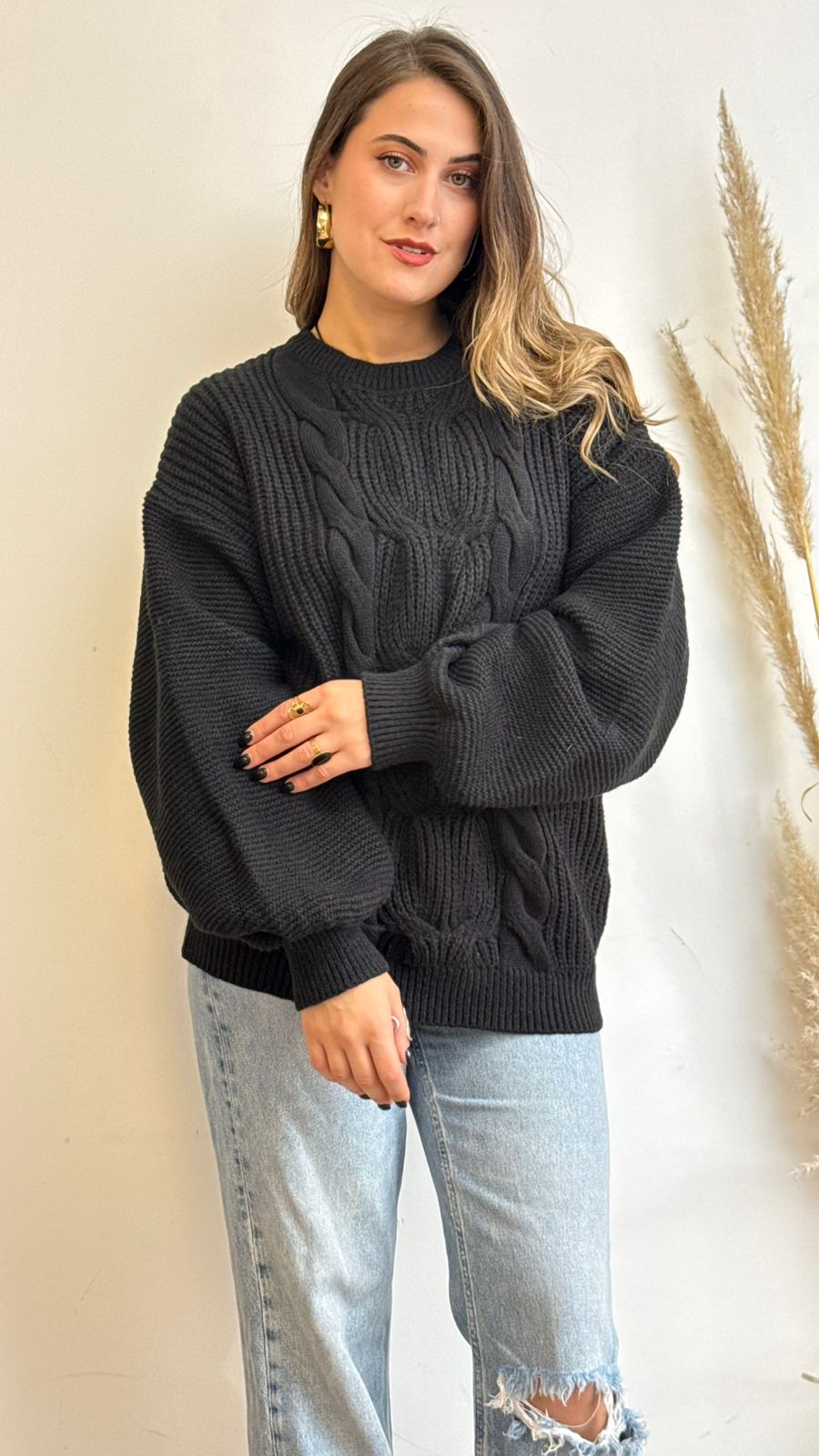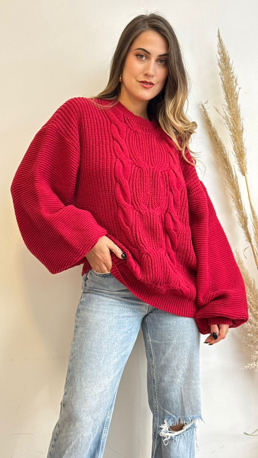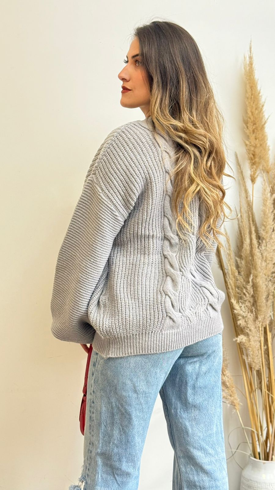 Chaleco tipo lana oversize con diseño trenzado en el centro y con manga ancha, ideal para los días más fríos.
