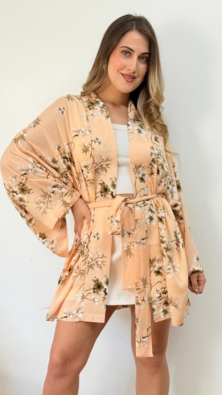DESCRIPCION: HERMOSO TAPADO TIPO KIMONO FLOREADO CON MANGA ANCHA Y LAZO.