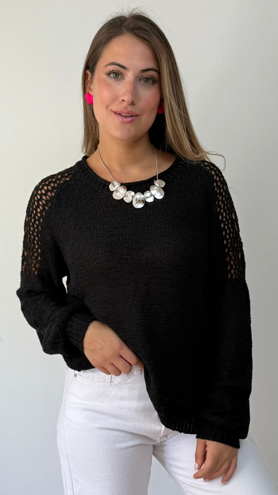 Tejido de tela liviana con cuello redondo y diseño flor en los hombros. Calce cómodo y fácil de combinar.