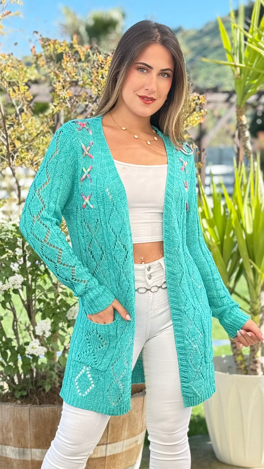 Tejido calado, liviano y con detalle de hilos cruzado colores que le da un toque femenino y elegante. Ideal para la transición de temporada o para complementar looks primaverales. Posee bolsillos delanteros y mangas con diseño calado.
